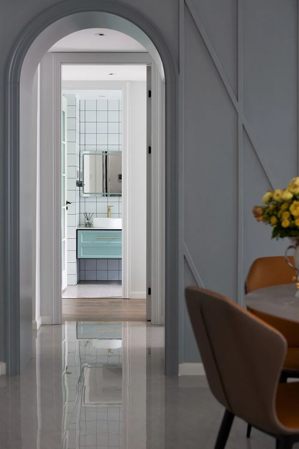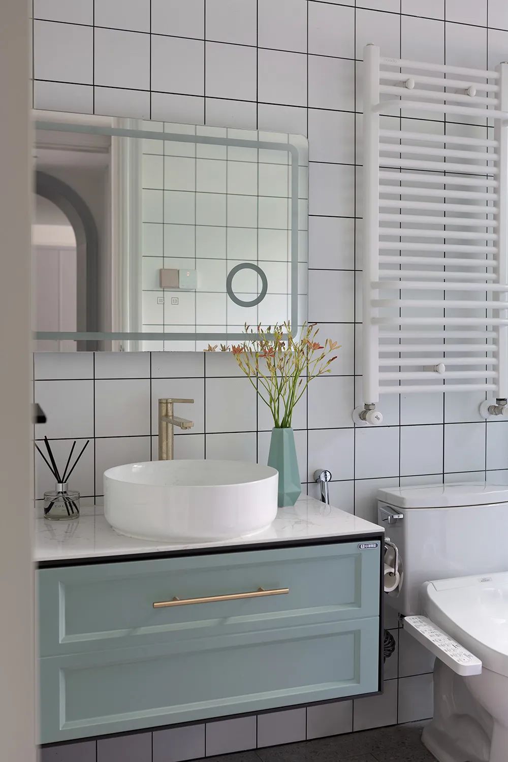 客衛實現三分離,洗漱區外移到過道,越長衛浴櫃+鏡櫃還有壁龕的設計,保證了充足的儲物,時刻保持空間的乾淨整潔。