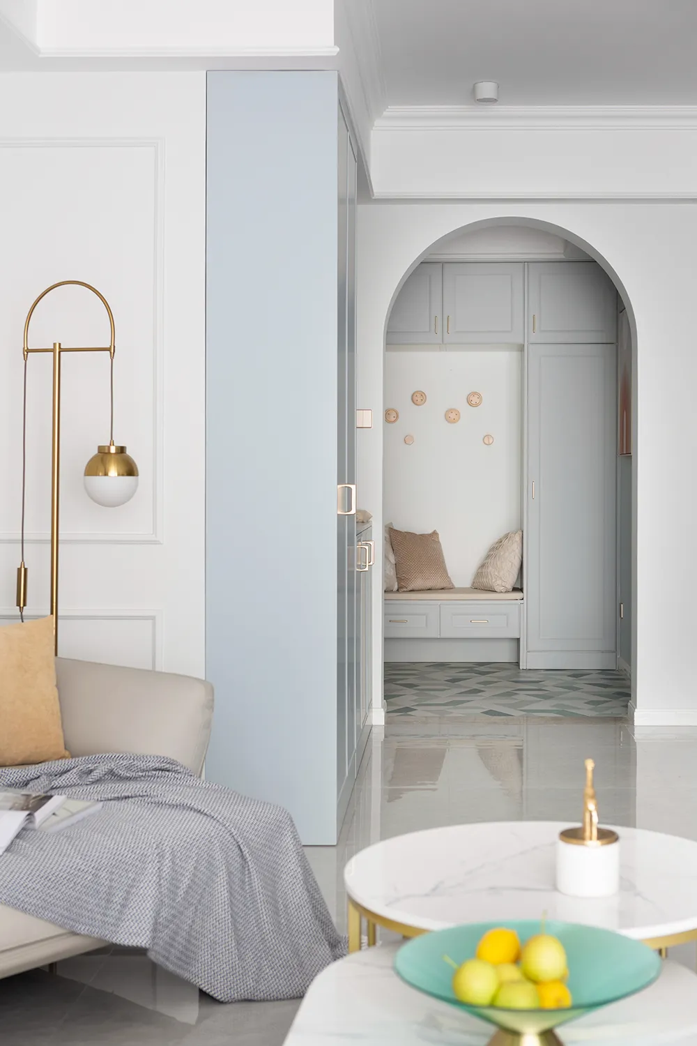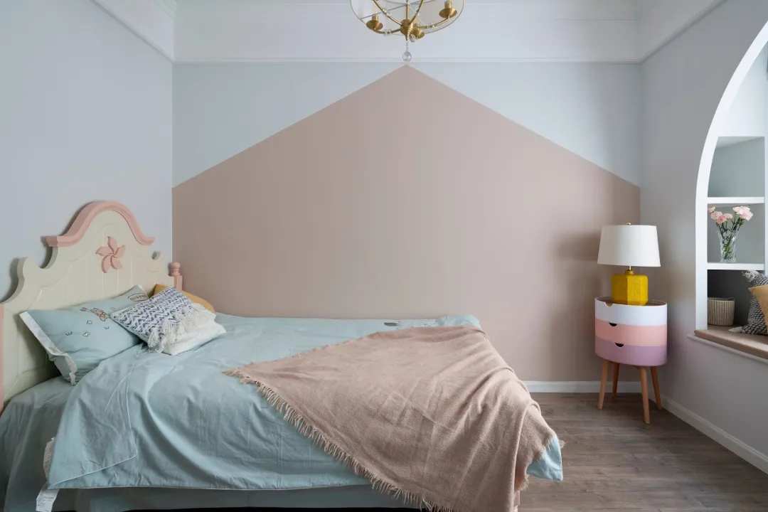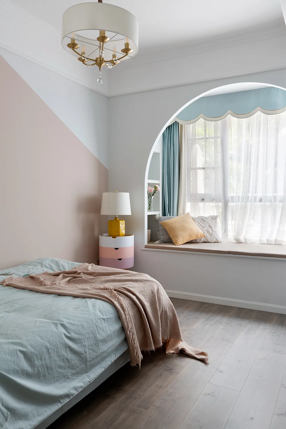 這套三居室位於一樓,因為採光不是很好,色彩上,設計師選用了高明度的馬卡龍色系,很好的解決一樓光線的問題,而且整個家都是採用馬卡龍色系,打造出清新而有活力的空間氛圍。