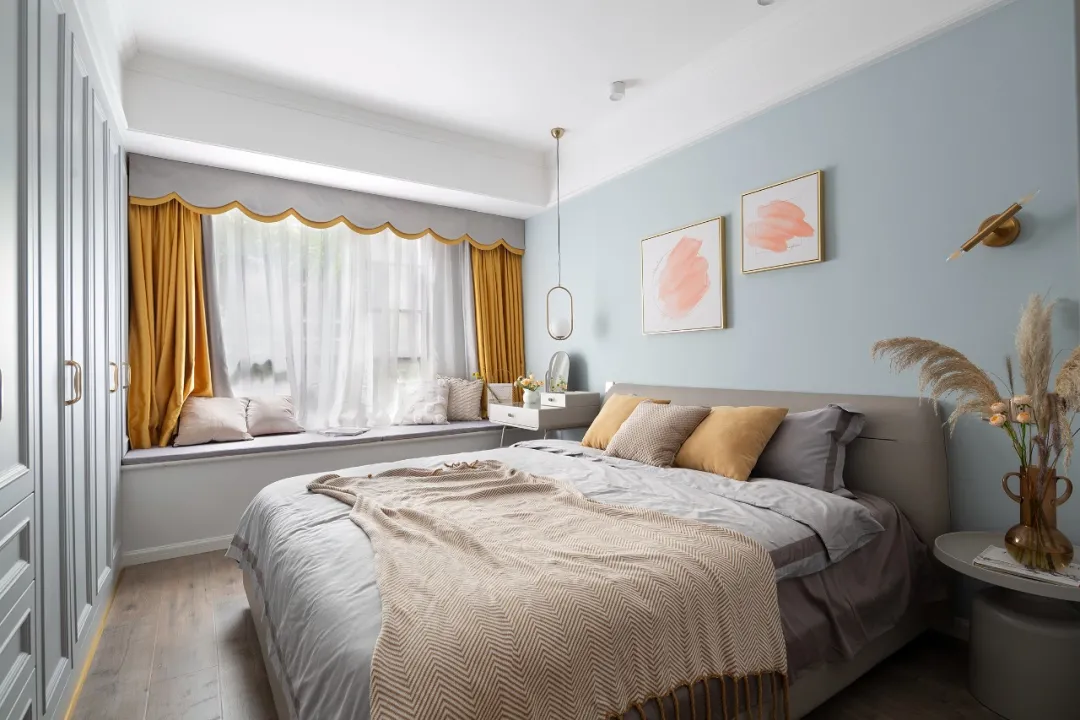 主臥是一個空間的重點設計區域,也是判斷一家人生活舒心與否的地方。 馬卡龍藍色帶來的清新淡雅,與熱烈的黃色形成了強烈的對比。