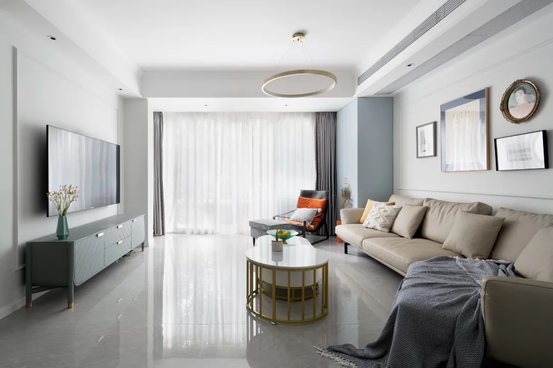 客廳的藍色定製櫃,米色沙發,還有千鳥格+活力橙的貴妃沙發,色彩以它獨特的視覺語言創造出空間的層次。