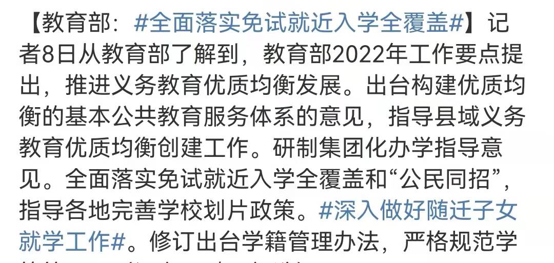 教育部在2022年工作要點中提出,推進義務教育優質均衡發展,將全面落實免試就近入學的政策。這就意味著以往的小升初擇校考將徹底退出歷史的舞臺,以往小升初的擇校考可以說讓不少的優質學校囊括了一批又一批的優質生源,也創造了一個個又一個的升學神話。