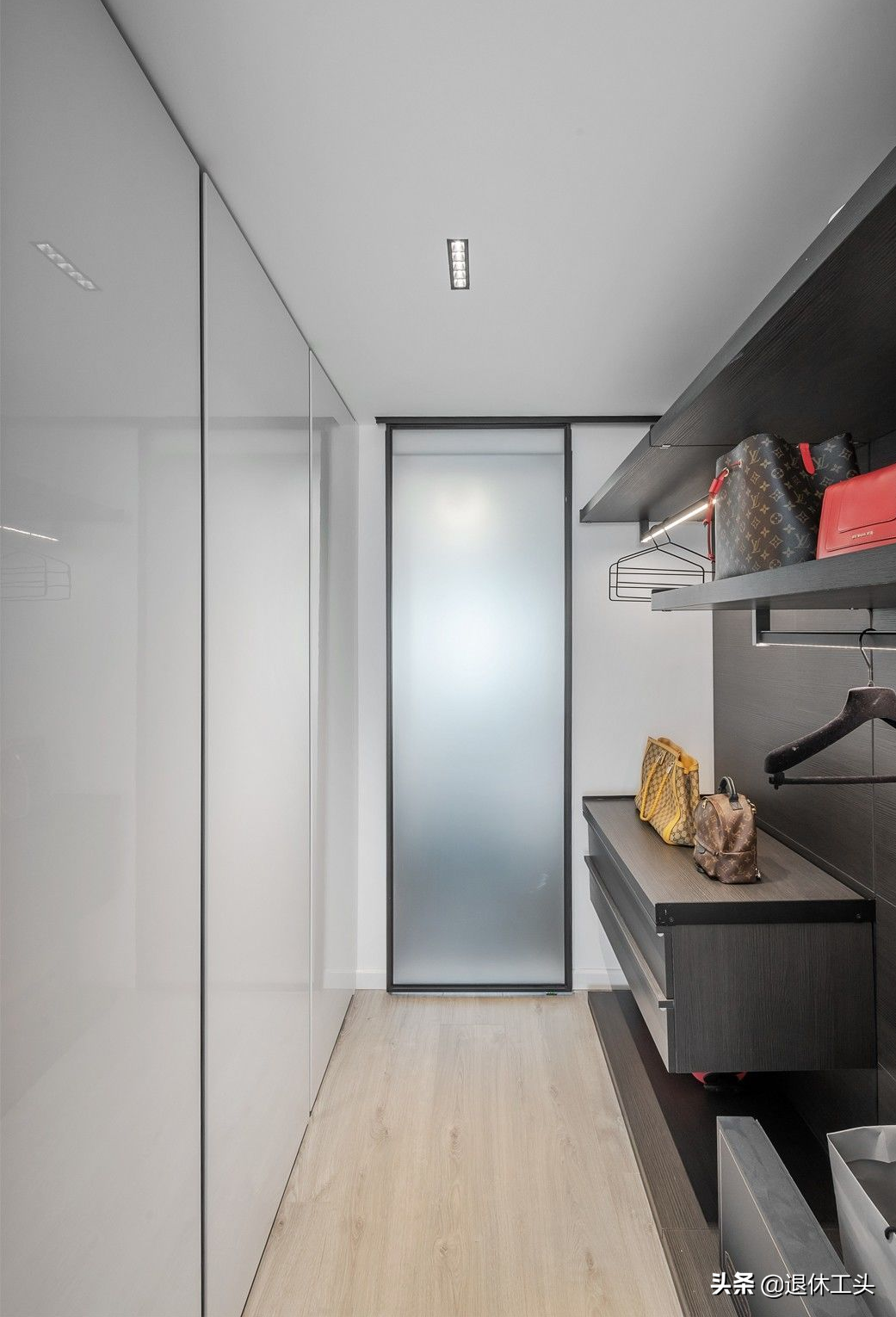 衣帽間的空間很大,一面牆是放著衣服的櫃子,另一側打字高低檯面的櫥櫃,上面擺放女主的包包,可容納很多的物品。