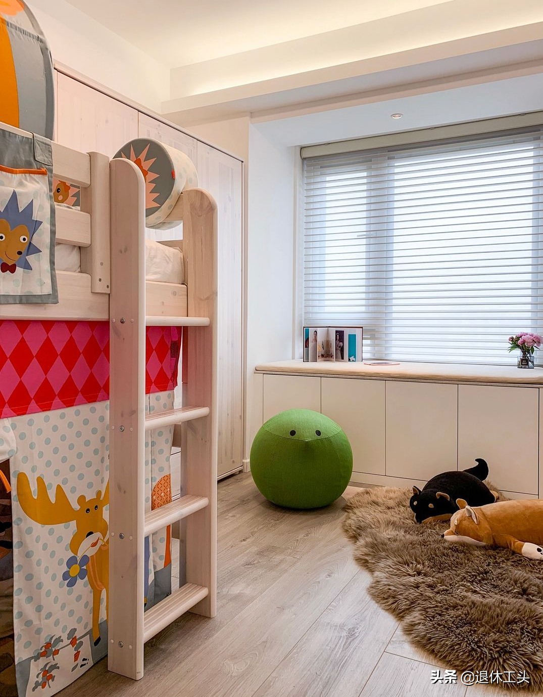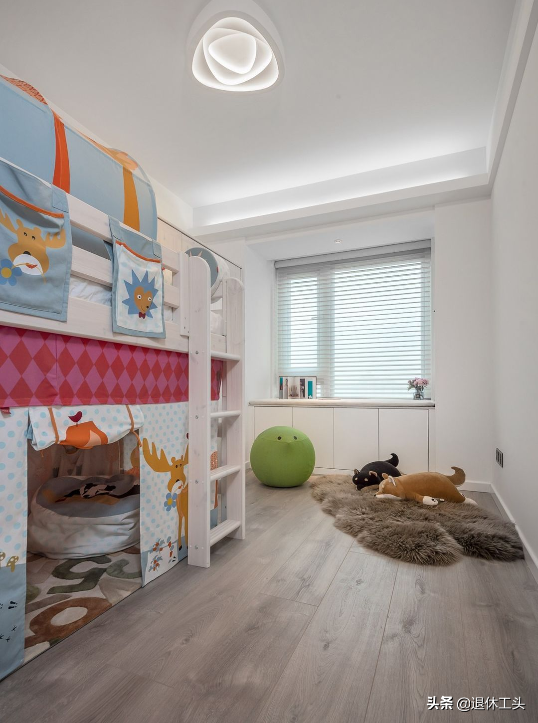 孩子房間床是上下層的,兩層都做了帳篷的形式,讓孩子覺得身在戶外,帳篷上面的圖案選用卡通人物,給孩子一個活躍的氣氛。地面選用木質地板,不會冰著腳。除此之外擺放了毛絨絨的地毯,配合兩隻可愛的小動物玩具,打造童趣空間。