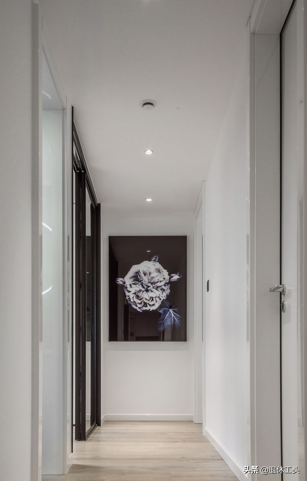 走廊處選用小燈,並排成線條,視線上有一定的拉伸效果。對應面有一幅裝飾畫,可算做入戶處的端景。