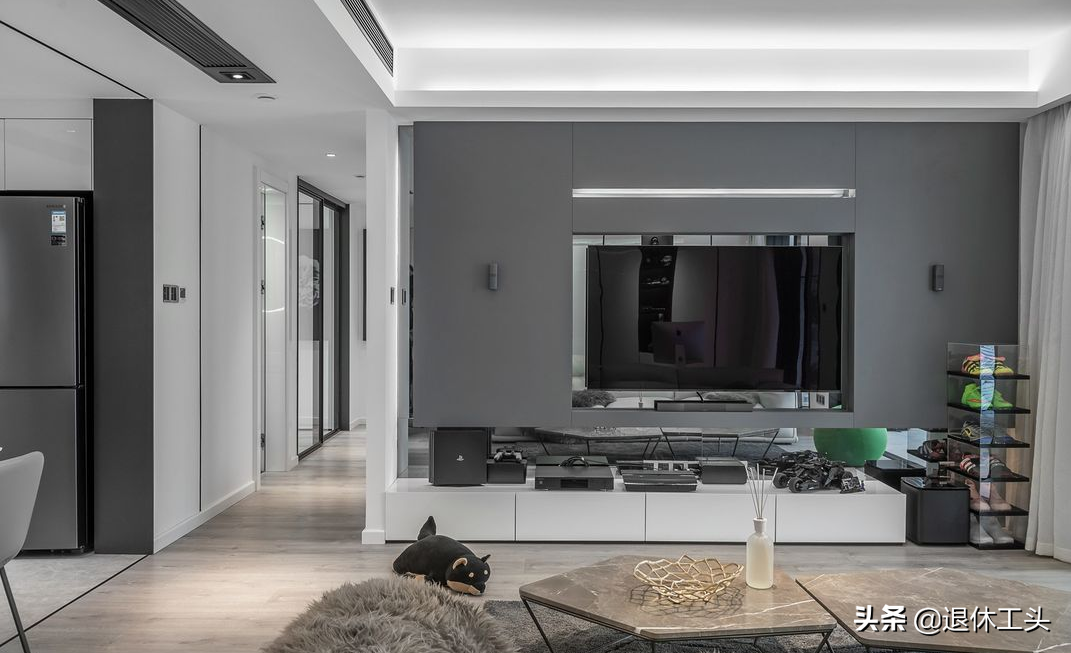客廳空間這裡有運用白色和灰色來搭配。尤其是電視牆部分運用灰色進行打底,襯托黑色的電視,搭配白色的木質茶几,色彩分明,而且有衝擊感。