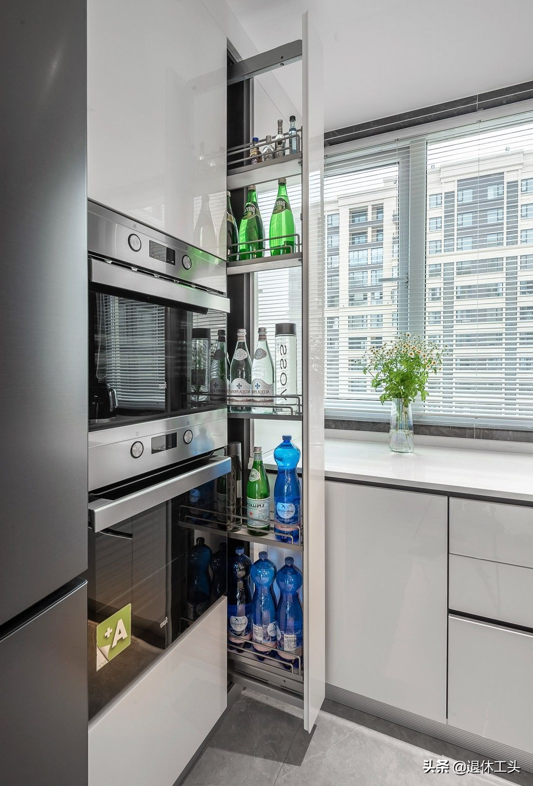 廚房櫥櫃是L形態的,櫥櫃選用白色,上面的牆體選用灰色,讓其空間產生層次感。如果全選用白色,色彩上就會顯得單調。