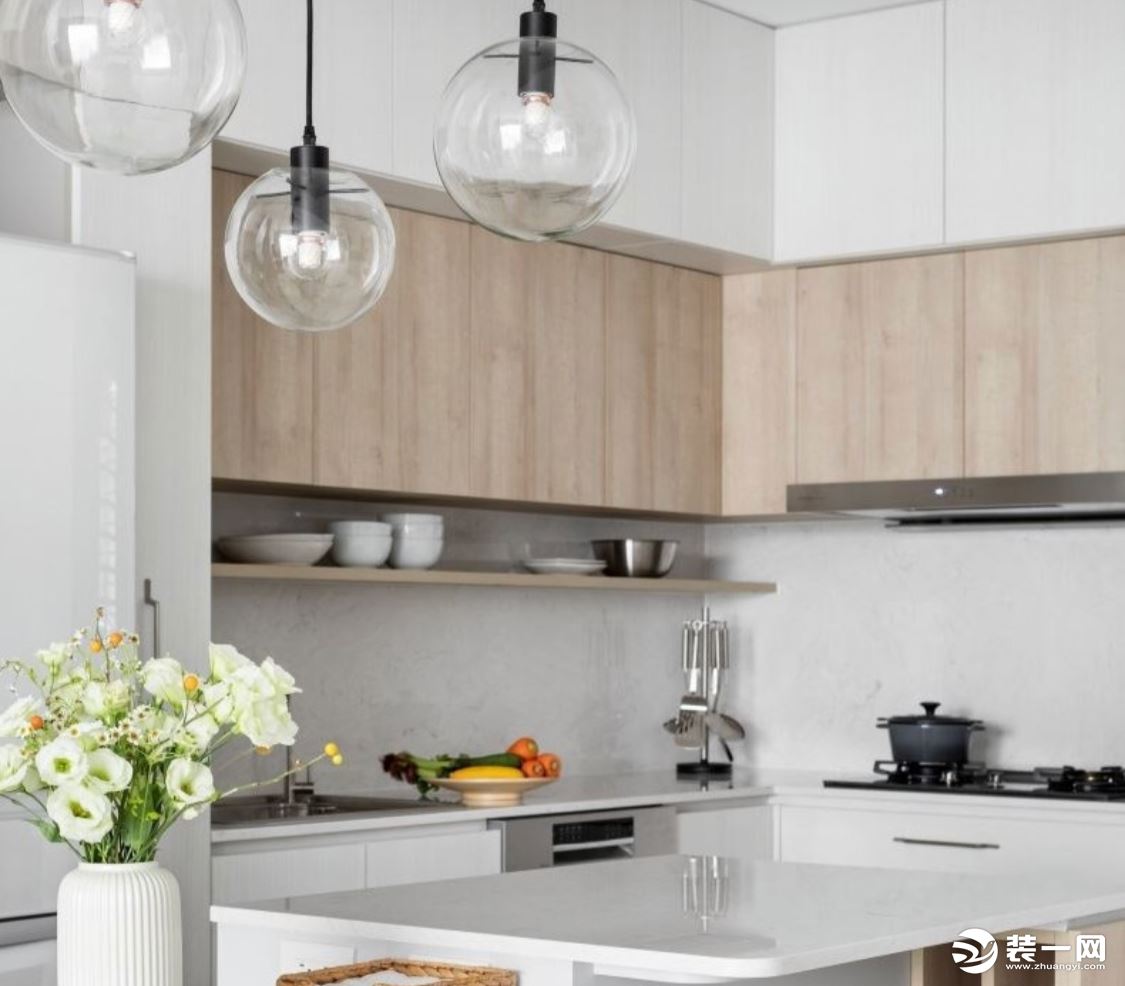 想把廚房的收納做到極致,需要巧妙利用牆面的空間,在吊櫃下多加裝一塊隔板,從而讓牆面化身為儲物臺。值得注意的是隔板寬度要依照日後所放物品的寬度來設計。