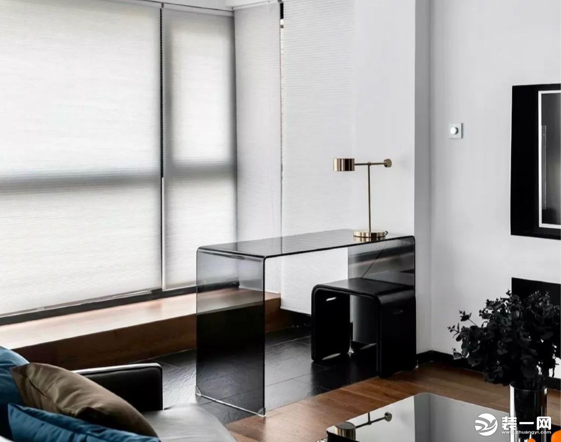而抽拉式書桌不光很好地利用了飄窗臺,上方空間還可以當做小沙發使用。