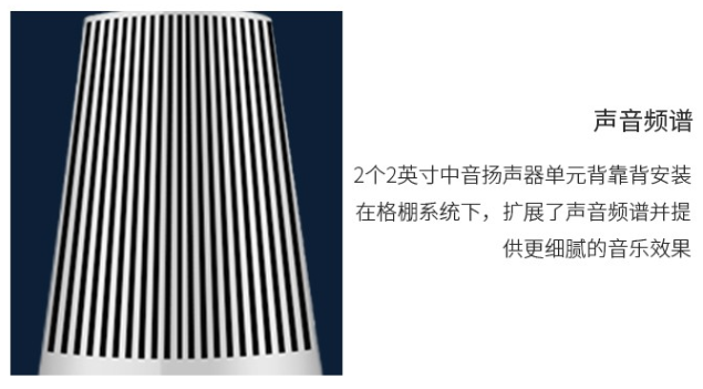 在格棚系統下安裝了2個2英寸的中音揚聲器單元背靠背,使得音訊能360度擴散開來。