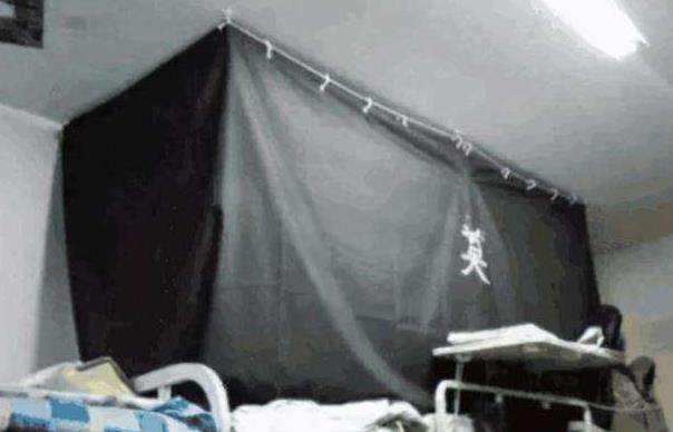 大學宿舍裡,不少學生為了保護個人隱私會網購床簾,在選擇款式時一個是考慮遮光度,一個是考慮美觀,但有些大學生在選擇床簾的時候似乎是奔著“作死”去的,直接扯了一塊黑布,上面寫著一個大大的“奠”字,佈置得好像殯儀館一樣,就算室友習慣了,來竄宿舍的同學也得嚇一跳。