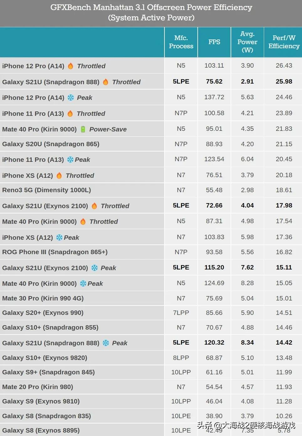 然而,驍龍 888 的表現並不如人意,這都歸罪於嚴重的發熱與高功耗。AnandTech 評測資料顯示,驍龍 888 的 GPU 雖然峰值效能比上一代的驍龍 865 有所提升,但因為嚴重的發熱、過高的功耗導致降頻,出現大幅度的效能下降。