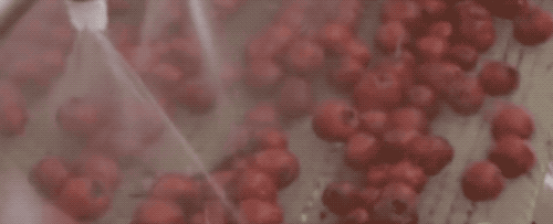 首先,和大多數水果加工流程一樣,要把原料的果子們清洗乾淨。下圖是山楂在氣泡清洗機的水箱中,被氣泡翻拱著清洗,並隨著傳送帶前進。