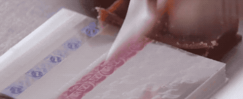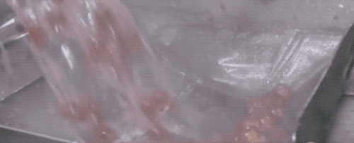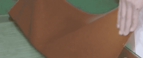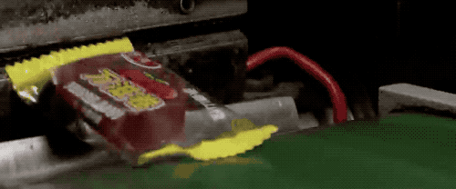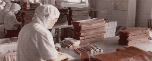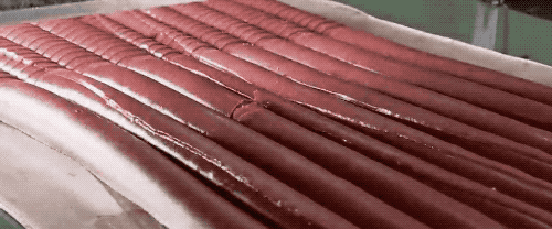包裝紙兩邊被自動對摺成 V 型,然後再緩慢疊加到一起,再被一熱切,就形成了一個個獨立小包裝~