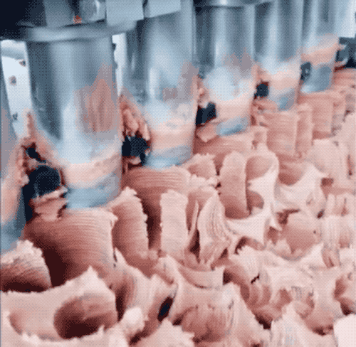 我第一次眼見為實,還是朋友轉給我的影片,偶然發現抖音裡好多工廠 po 的影片都是這麼加工出的圓片。托盤裡是一整摞的山楂脆片,向上移動,被一整排的空心圓管子切出小圓片,然後移動著繼續切。有時候我們會發現山楂片上有個小缺口,真相大白了!
