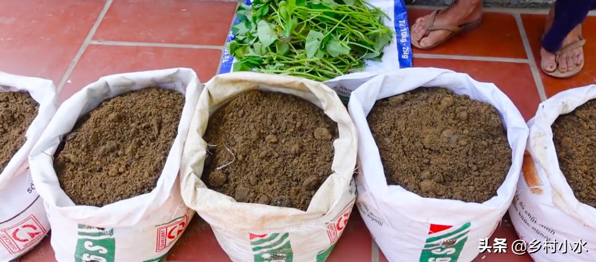 配製好營養土後,我們就可以裝袋了,裝袋時泥土儘量裝滿,然後把蛇皮袋(編織袋)橫放(也可以豎放,袋子橫放產量更高),一般一個袋子扦插3株紅薯苗。