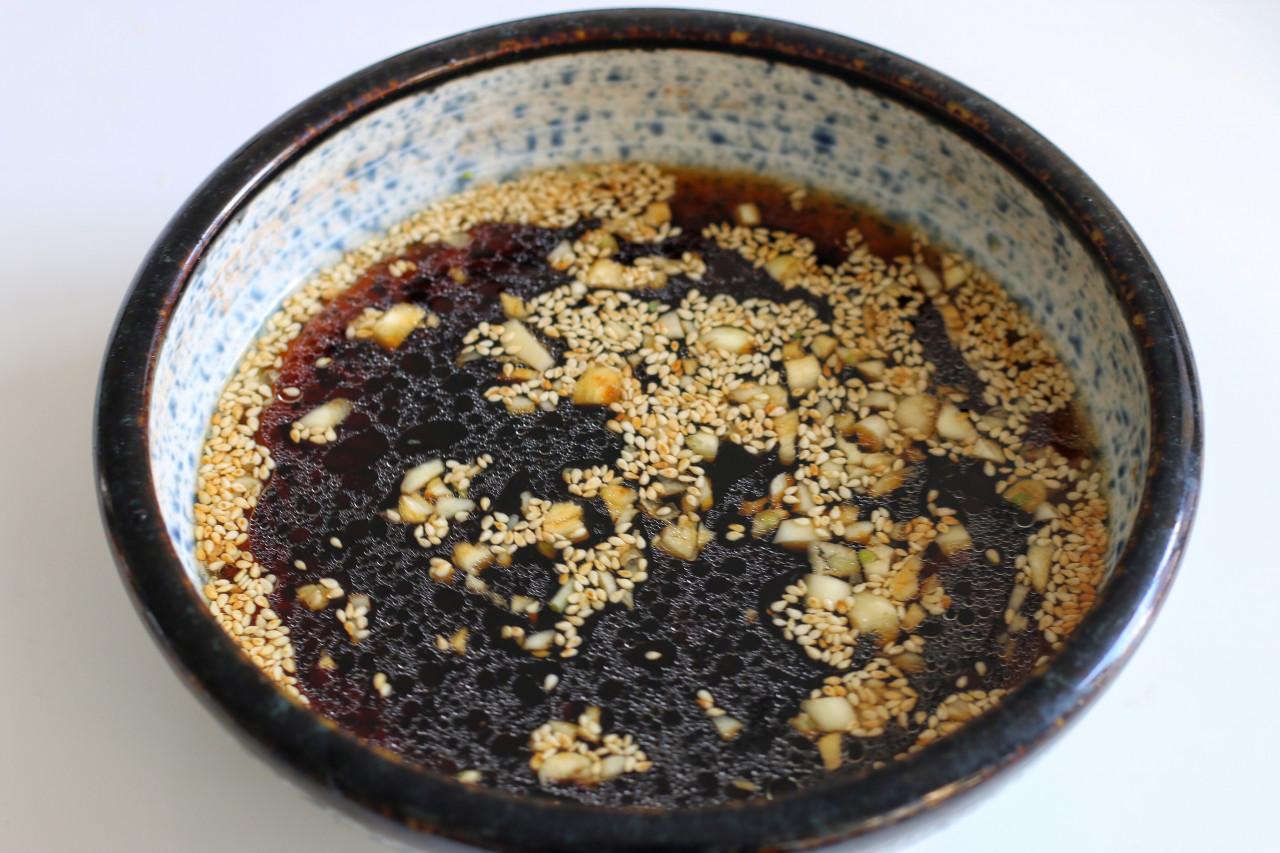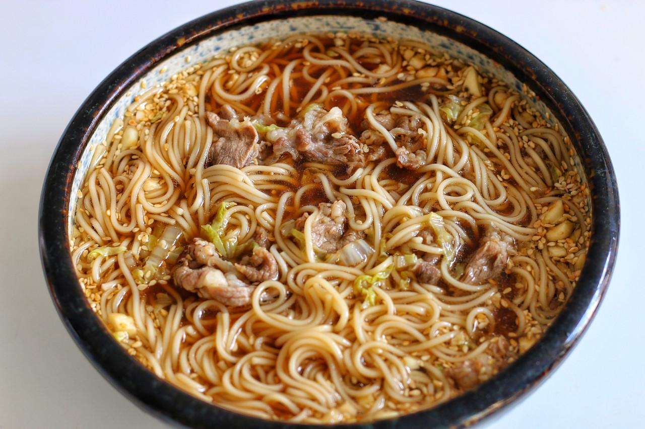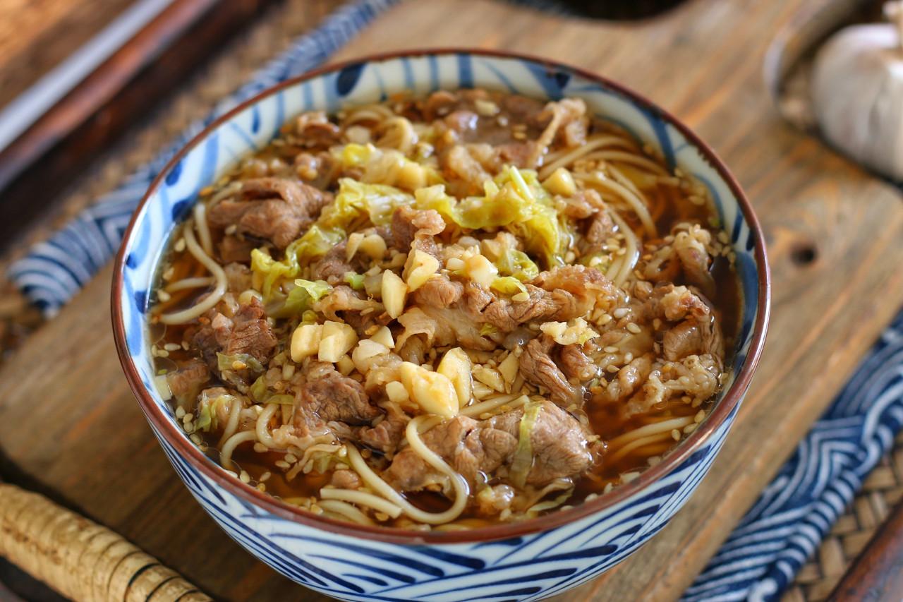 【食材】:掛麵1把、白菜兩葉、肥牛片2兩、蒜半頭、熟的白芝麻1湯匙、生抽1湯匙、陳醋或米醋3湯匙、油鹽少許。