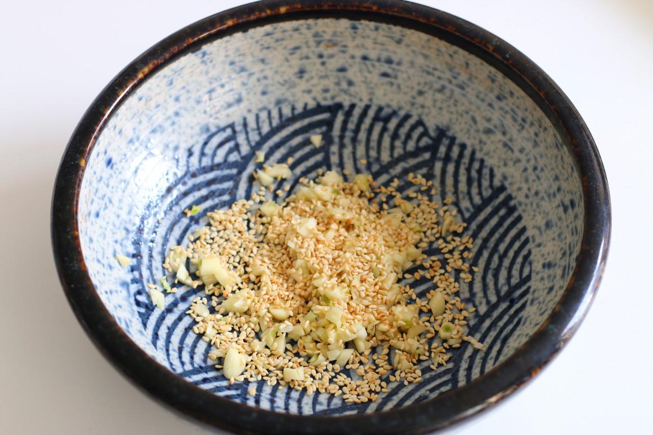 3、燒水,準備煮麵。同時,把蒜切碎放進大碗裡,加入少許熟的白芝麻。無辣不歡的朋友可以放些小米椒圈或是辣椒麵。燒點兒熱油澆上去,把蒜末激出香味兒。