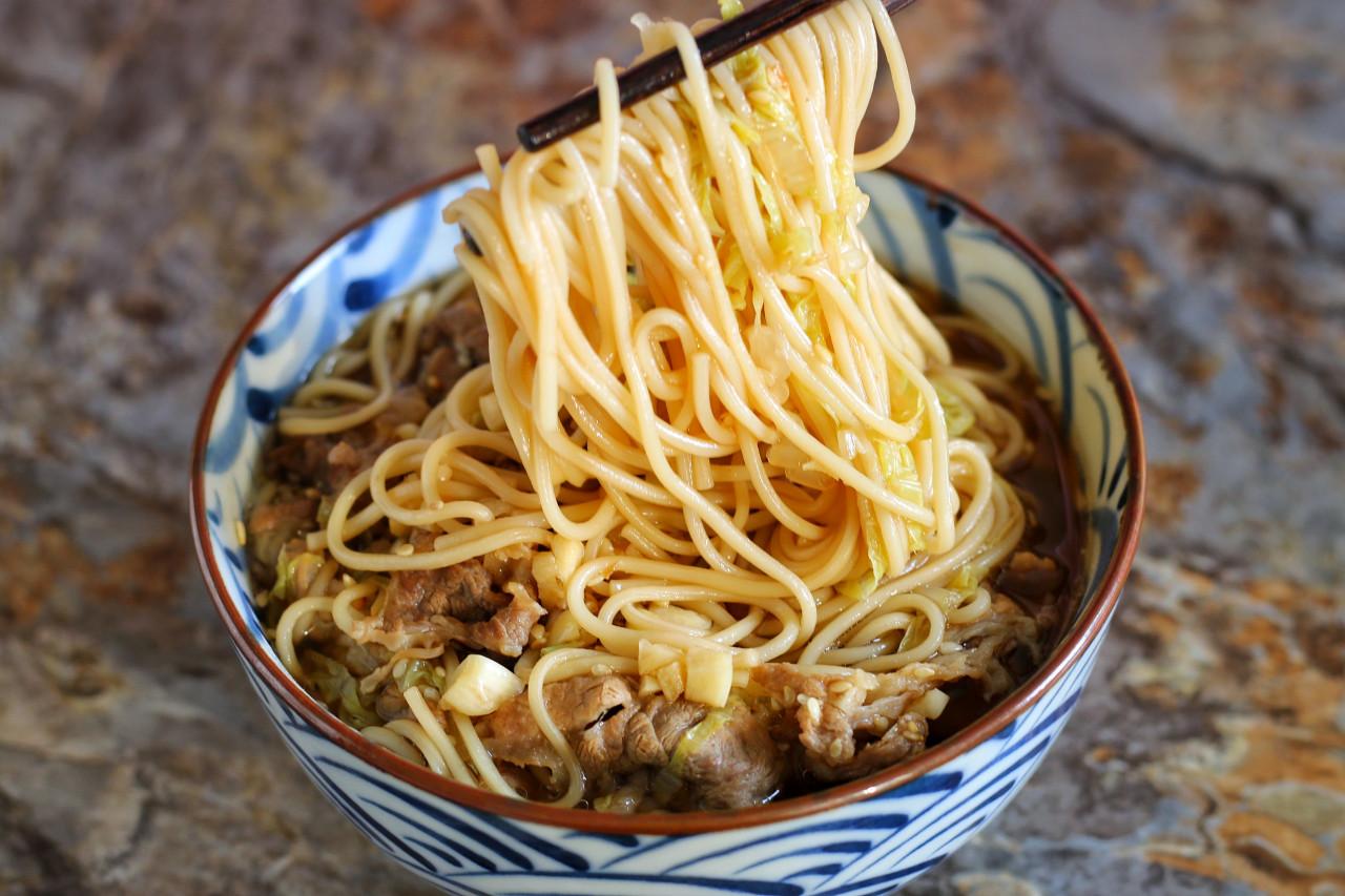 6、把面、肥牛片和白菜絲一起撈進兌好的調料汁裡,拌勻即可開動。
