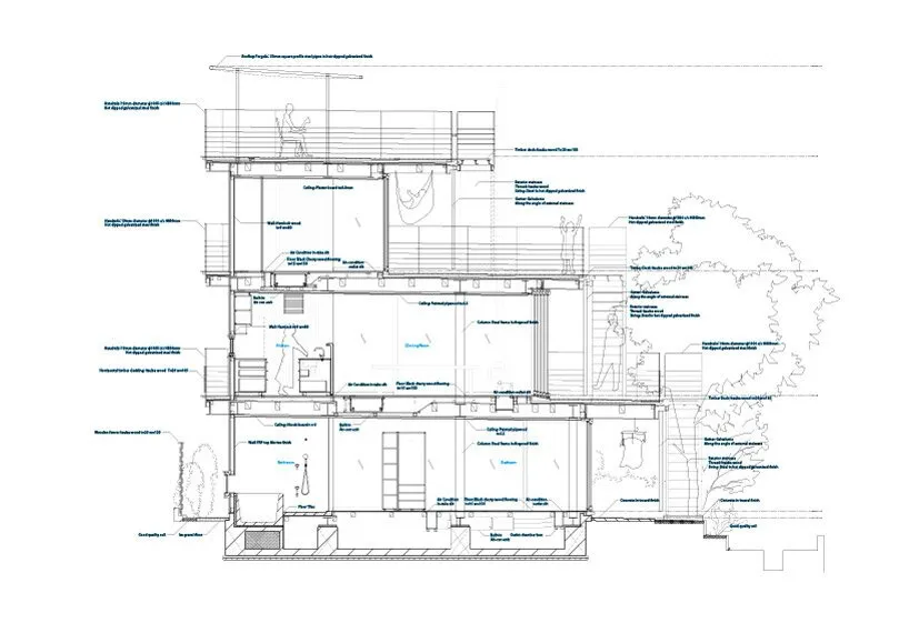 “但人們又不能一直住在花園裡,因為花園是一個讓人沉迷其中的環境。人們可以住在這個甲板上,這裡保持了隱私,長長的跨簷可以為居民擋雨,身處花園中,卻又可以保持適當的距離,遠離泥濘的土壤。”