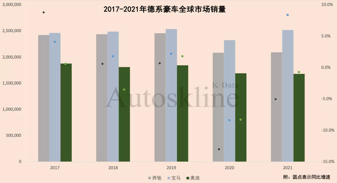 就像開篇所說,從車型儘可能相近的角度,寶馬集團與賓士乘用車2021年全球銷量分別為252萬輛和209萬輛,奧迪以168萬輛排名墊底。別的品牌與它們差距有點大,不再逐一而論。