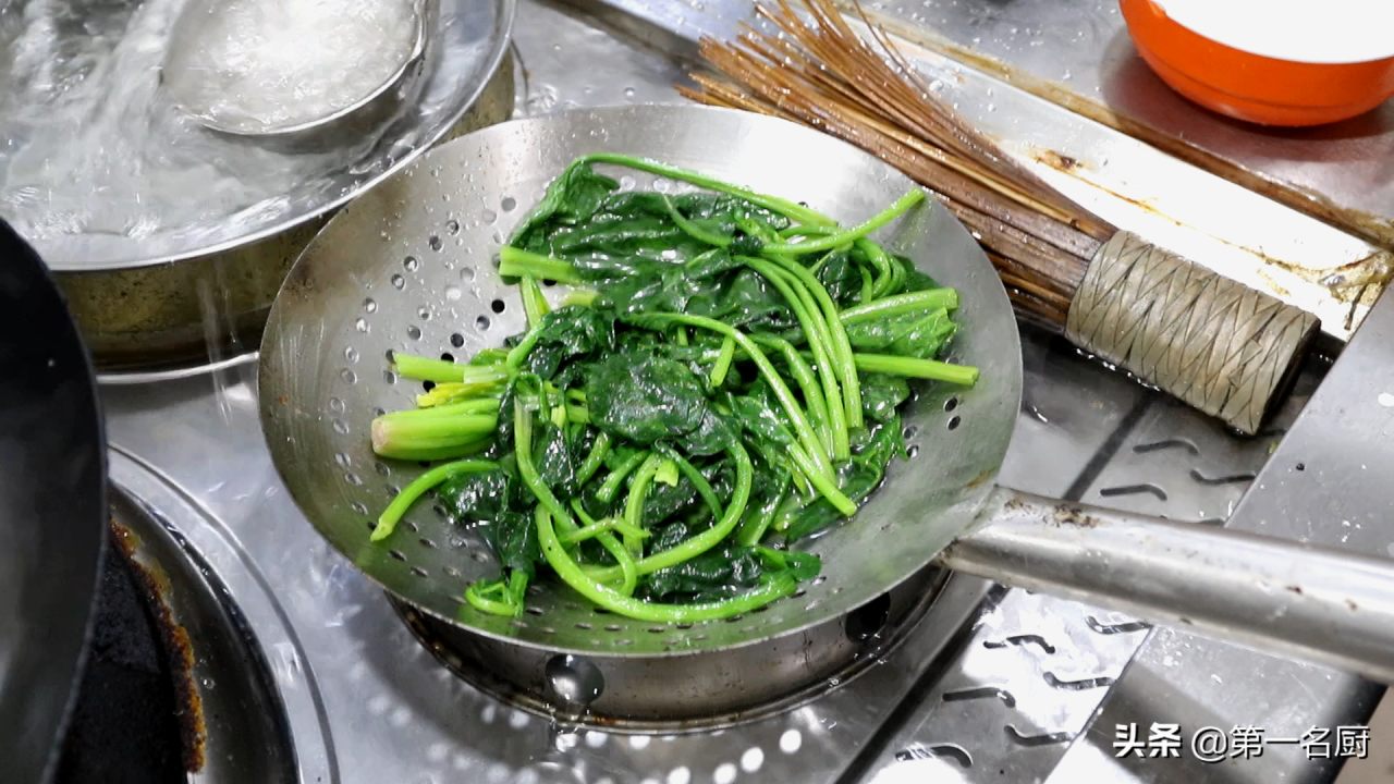 4.起鍋添入適量清水,加入少許食用油,增加色澤和亮度,再加入少許食鹽增加底味,等水燒開後,下入菠菜,用勺子翻動幾下,焯水10秒鐘,即可撈出控水拔涼。