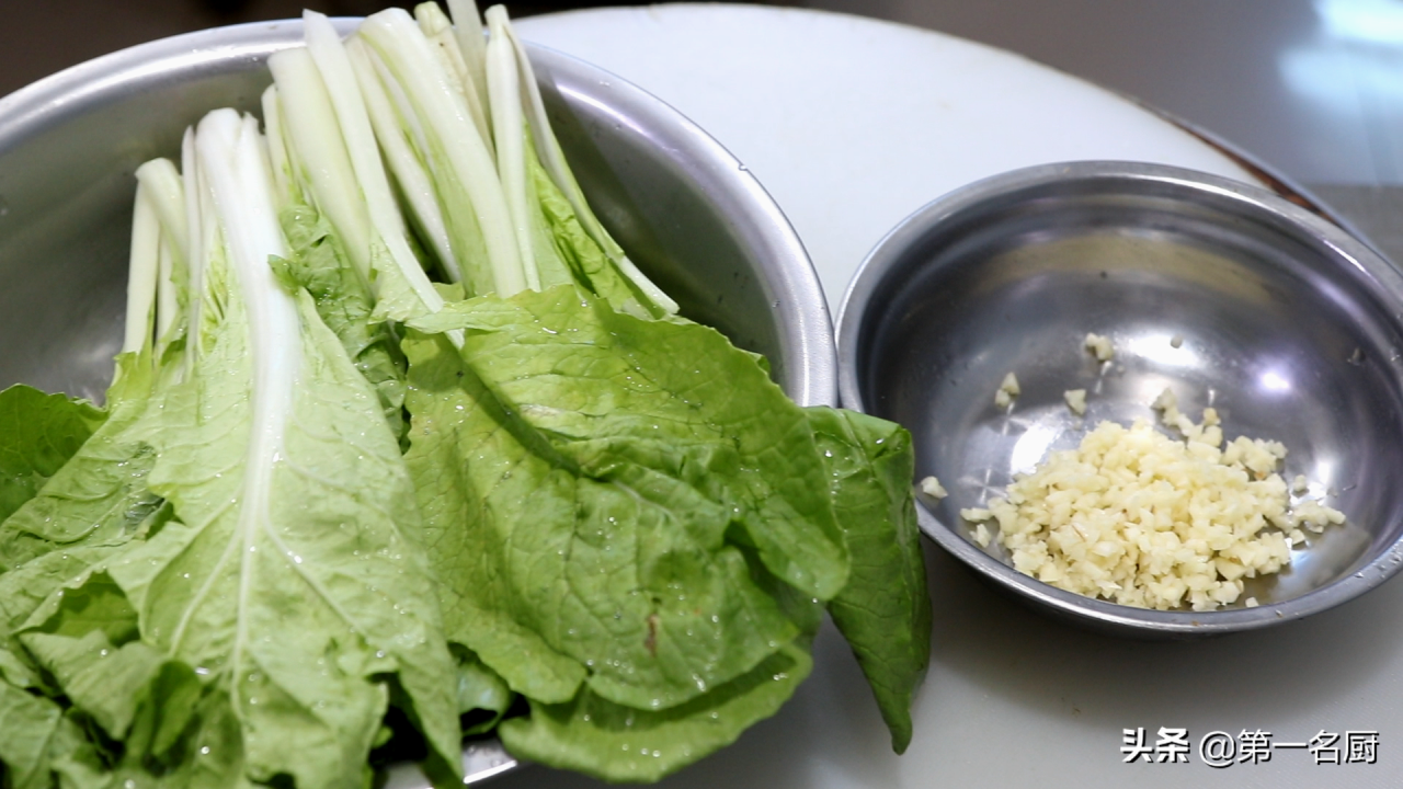 1.小白菜一把去掉根部,蒜子一小把拍扁,切成蒜末,放入小盆裡面。