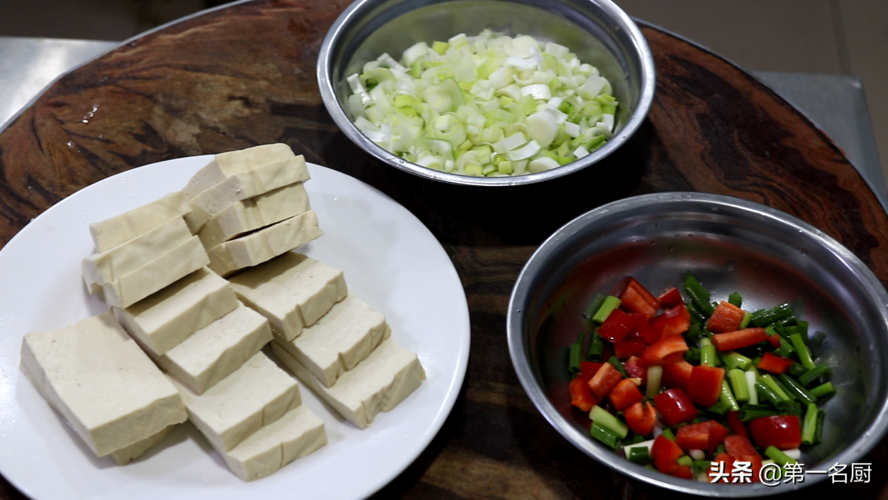1.準備老豆腐半斤左右,先從中間切開,再改刀切成厚片,大蔥兩根,切成蔥花,小蔥3根切成1釐米長的段,紅椒半個切成小片,一起放入盆中。