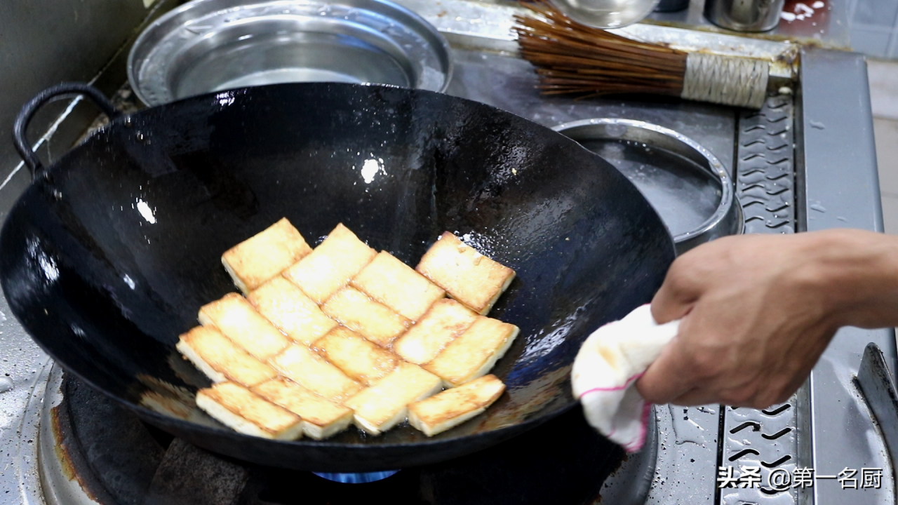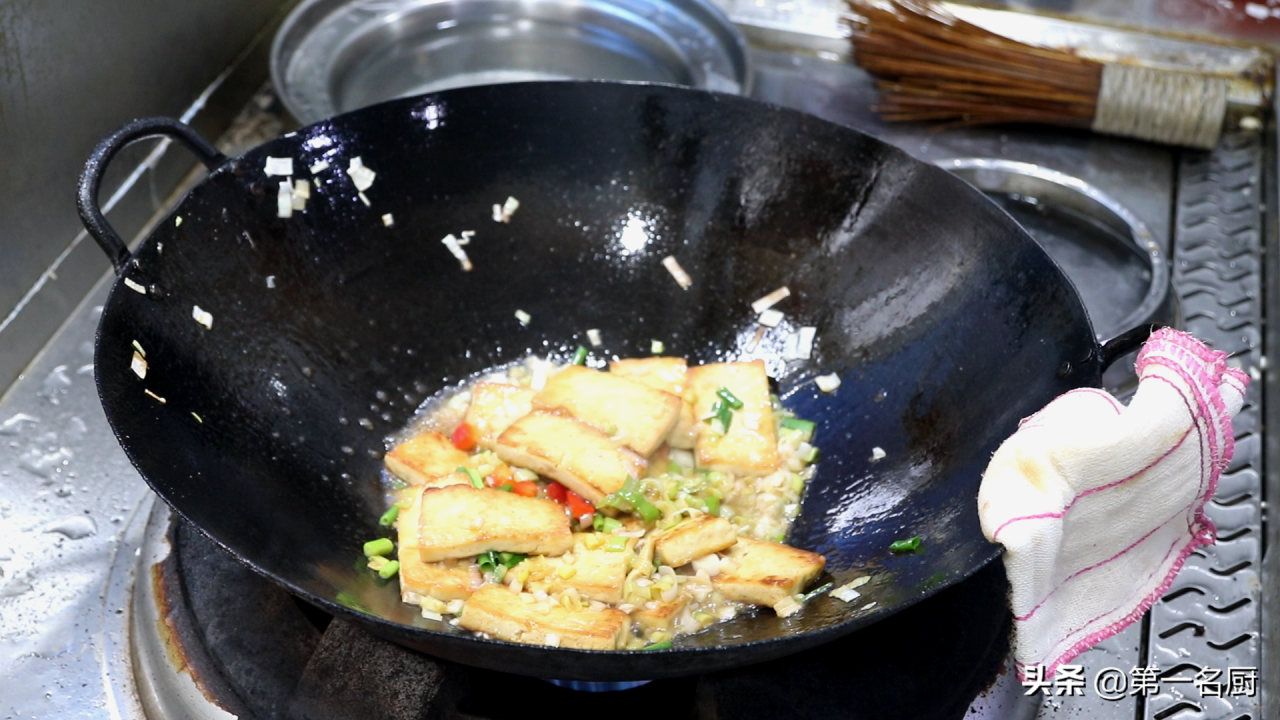 2.炒鍋燒熱添入食用油滑鍋,在鍋中撒上少許食鹽,放入豆腐塊,這樣既能增加豆腐的底味,又能避免豆腐粘鍋。