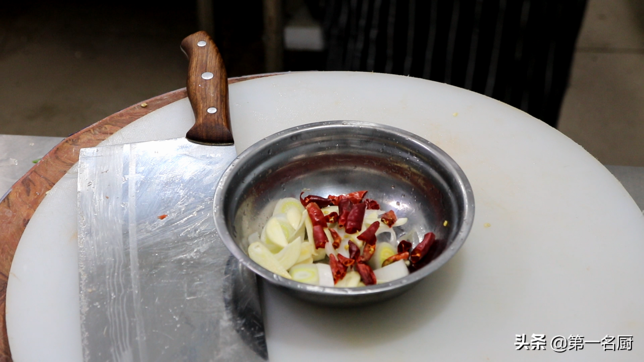 3.另起鍋添入少許食用油,放入幾粒花椒和紅幹椒,炸出香味以後關火,然後把熱油倒在蒜末上面,激發出蒜香味。