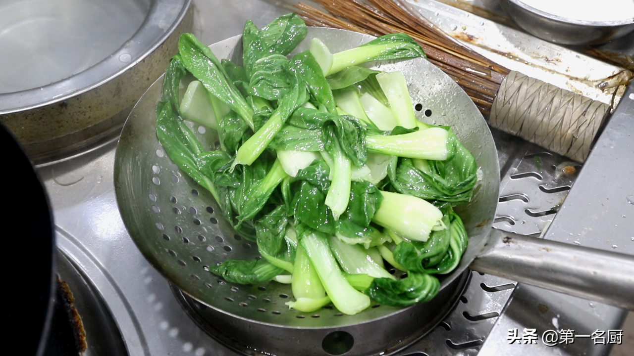 2.起鍋添入適量清水,加入一勺食鹽增加食材的底味,再加入少許植物油,水開後下入大青菜,翻動幾下,焯水10秒鐘,倒出控水。