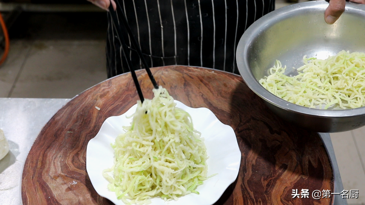 1.準備白蘿蔔1個,先切成薄片,再切成均勻的細絲,放入盆中,加入少許食鹽,用手反覆抓勻,放在一邊醃製10分鐘,把蘿蔔絲醃出水。