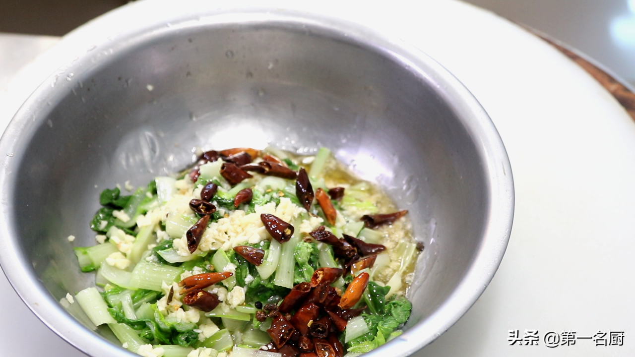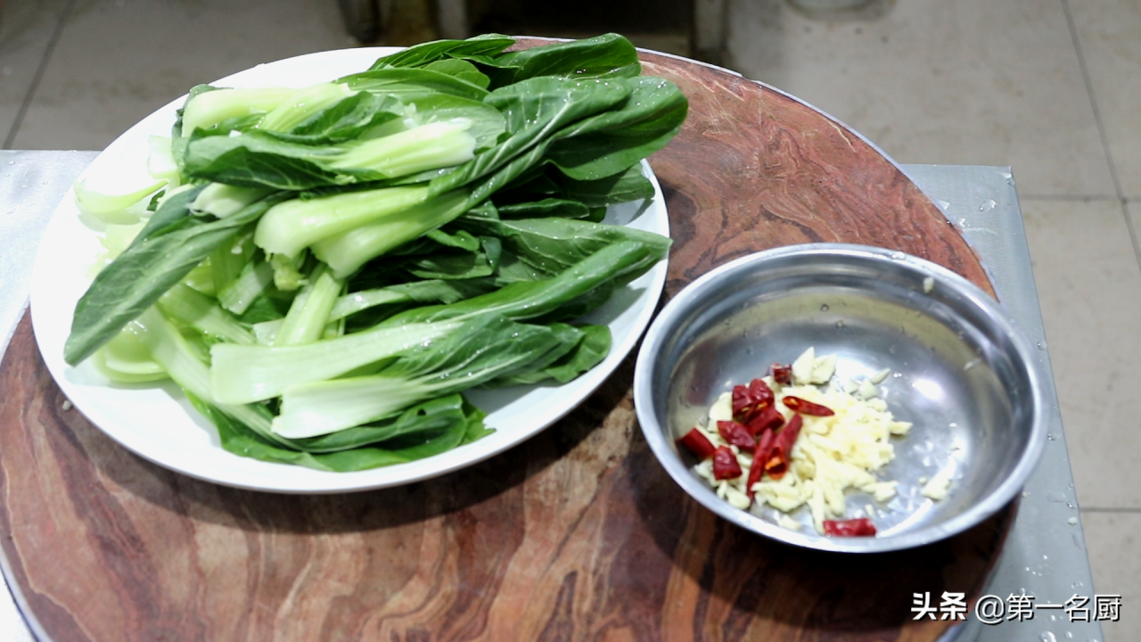 1.準備上海青300克,把葉子分開,放入盤中,蒜子幾粒拍扁切成蒜末,放入小盆裡面,再放入一把紅幹椒備用。