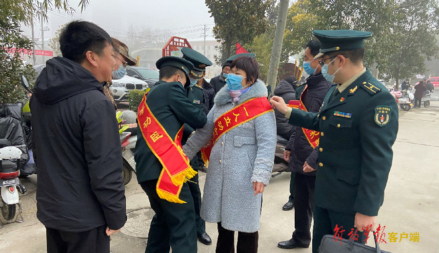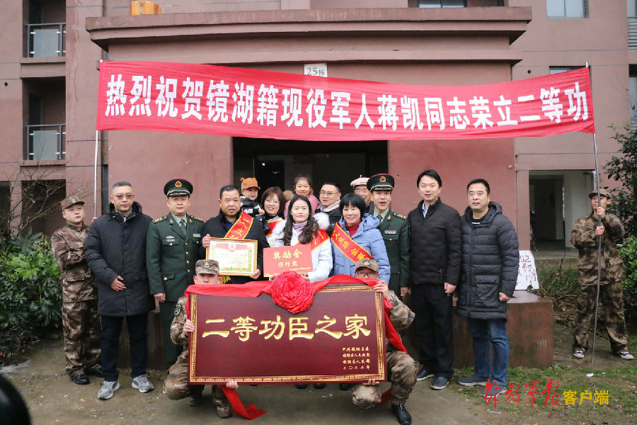 1月26日上午,冒著寒風和冷雨,安徽省蕪湖市鏡湖區人武部部長政委和區退役軍人事務局局長、荊山街道辦事處書記一行,代表鏡湖區區委、區政府將火箭軍某部現役軍官蔣凱同志榮立二等功的喜報,趕在節前送到其父親蔣克玉手中,讓這一家人的春節更加溫暖。