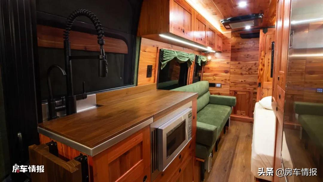 靠近乘客門的地方依舊是全車的廚房區域,桌面也全部使用了雪松木,看起來很有檔次,側面提供了可翻折的拓展桌板,檯面上則提供了基礎的水槽,帶有水龍頭,檯面下方嵌入了 一臺微波爐,後期在旁邊外接上行動式的電磁爐或者卡式爐,就可以滿足日常的烹飪需求了。