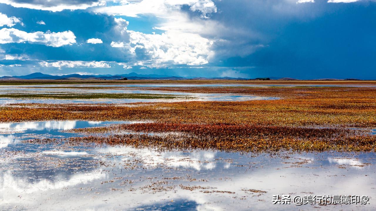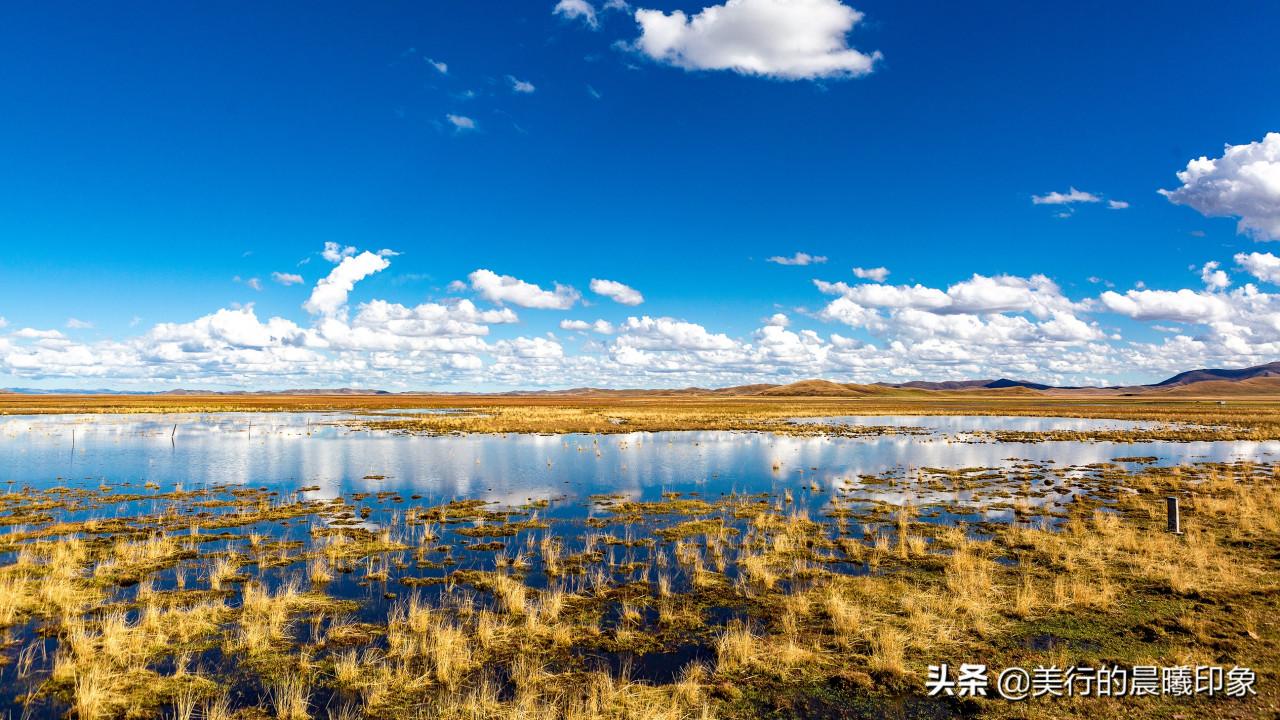 若爾蓋境內地勢平闊,青藏高原在隆升過程中形成的一個低凹地,四周群山環抱,是黃河上游一些大支流如黑河、白河、賈曲的匯流處。由於氣候寒冷溼潤,蒸發量小,排水不暢,地表經常處於過溼狀態,形成了我國最大的泥炭沼澤——若爾蓋沼澤,草地和沼澤交錯在一起,很難以辨別,在紅軍長征時期,紅軍過草地走過的就是若爾蓋沼澤,惡劣的自然環境給紅軍帶來了不少的障礙。在陽光下,若爾蓋沼澤熠熠發亮,並沒有想象的那麼恐怖。