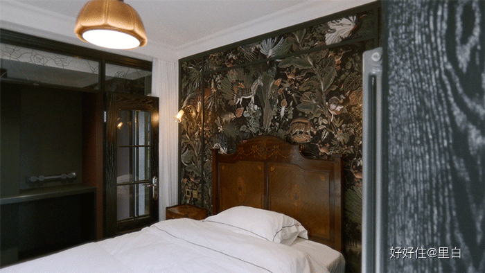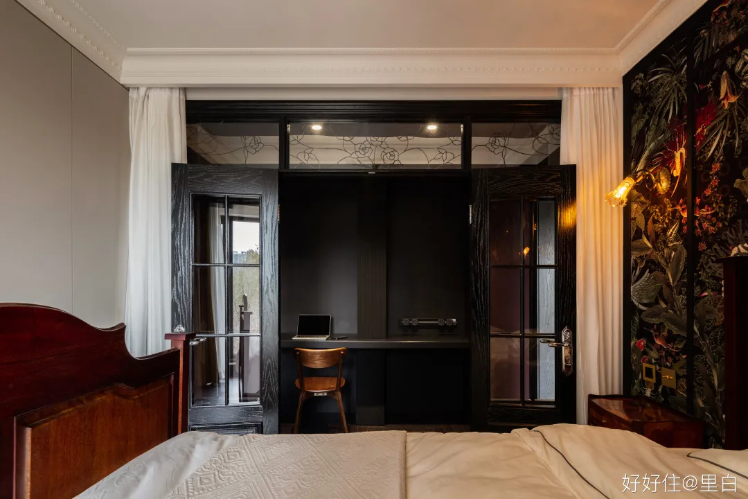 用黑色 PU 線在桌布上裝飾,搭配全銅的花朵壁燈,優雅迷人。為了保障睡眠質量,門後還加裝了簾子。