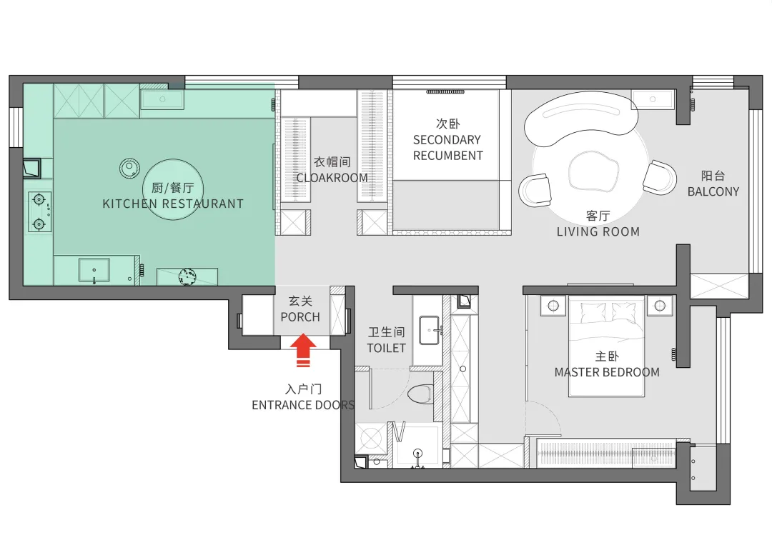 女主人在家時,會花很大一部分時間在廚房和衣帽區,她想要純開放式廚房,不要島臺。