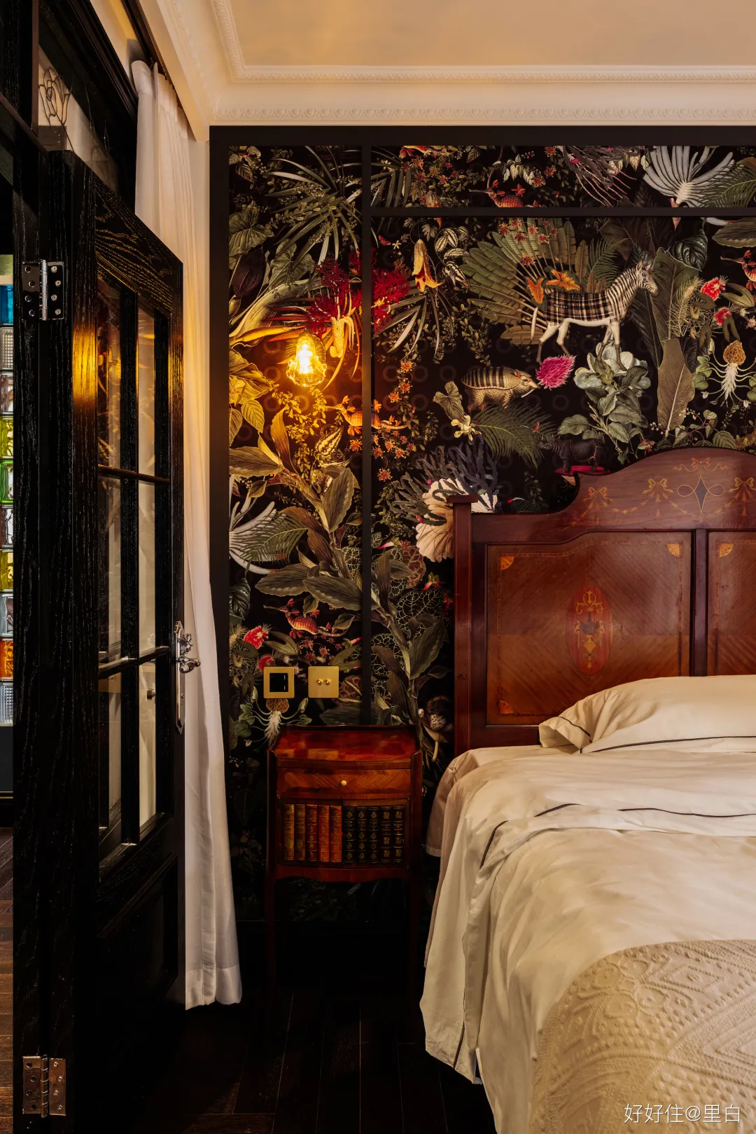 主臥每一件傢俱都是中古的孤品,淘來的實木雕花床和床頭櫃風格很相似。