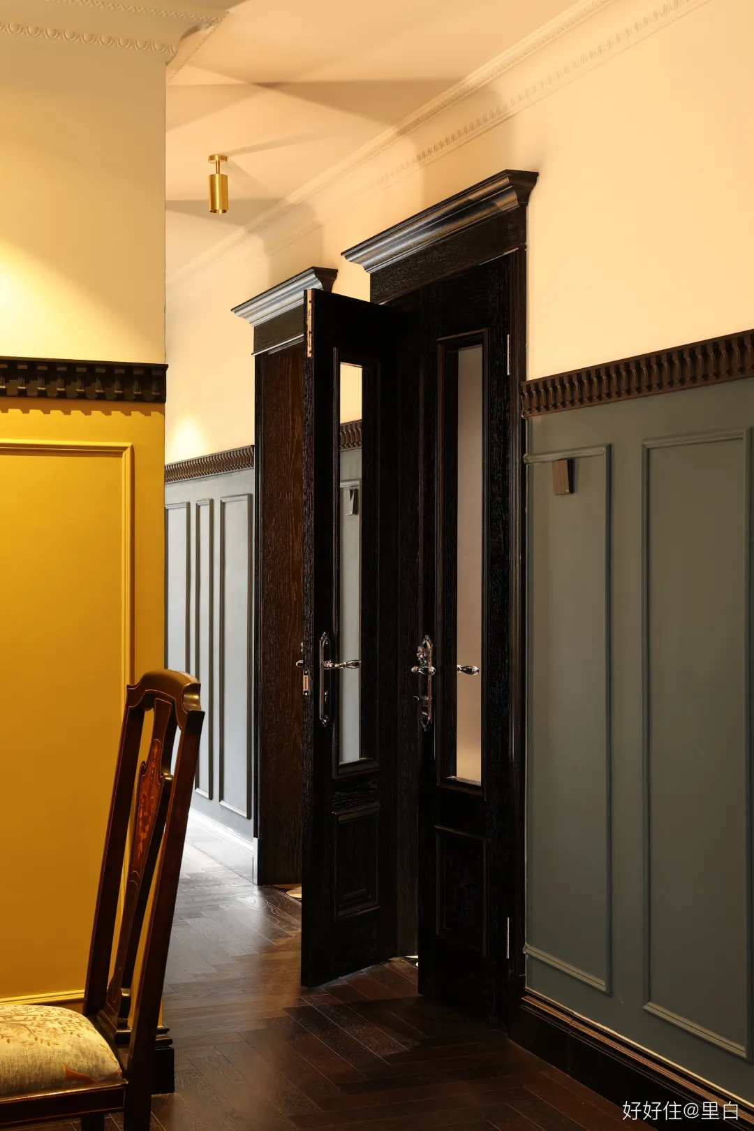 簡潔的頂角線用於視覺拉高;歐式PU線組合的門頭替代普通房門;公共區域的所有牆面,都用了黑色的石膏腰線。
