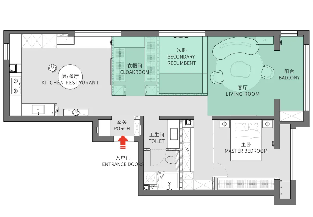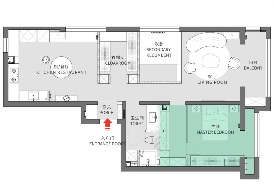 ⑤衛生間隔出一部分面積,設定辦公區,與主臥之間用玻璃聯動門分隔。