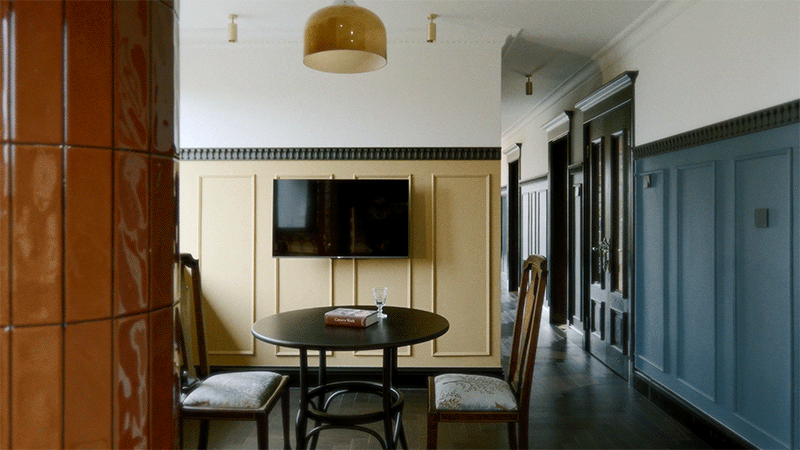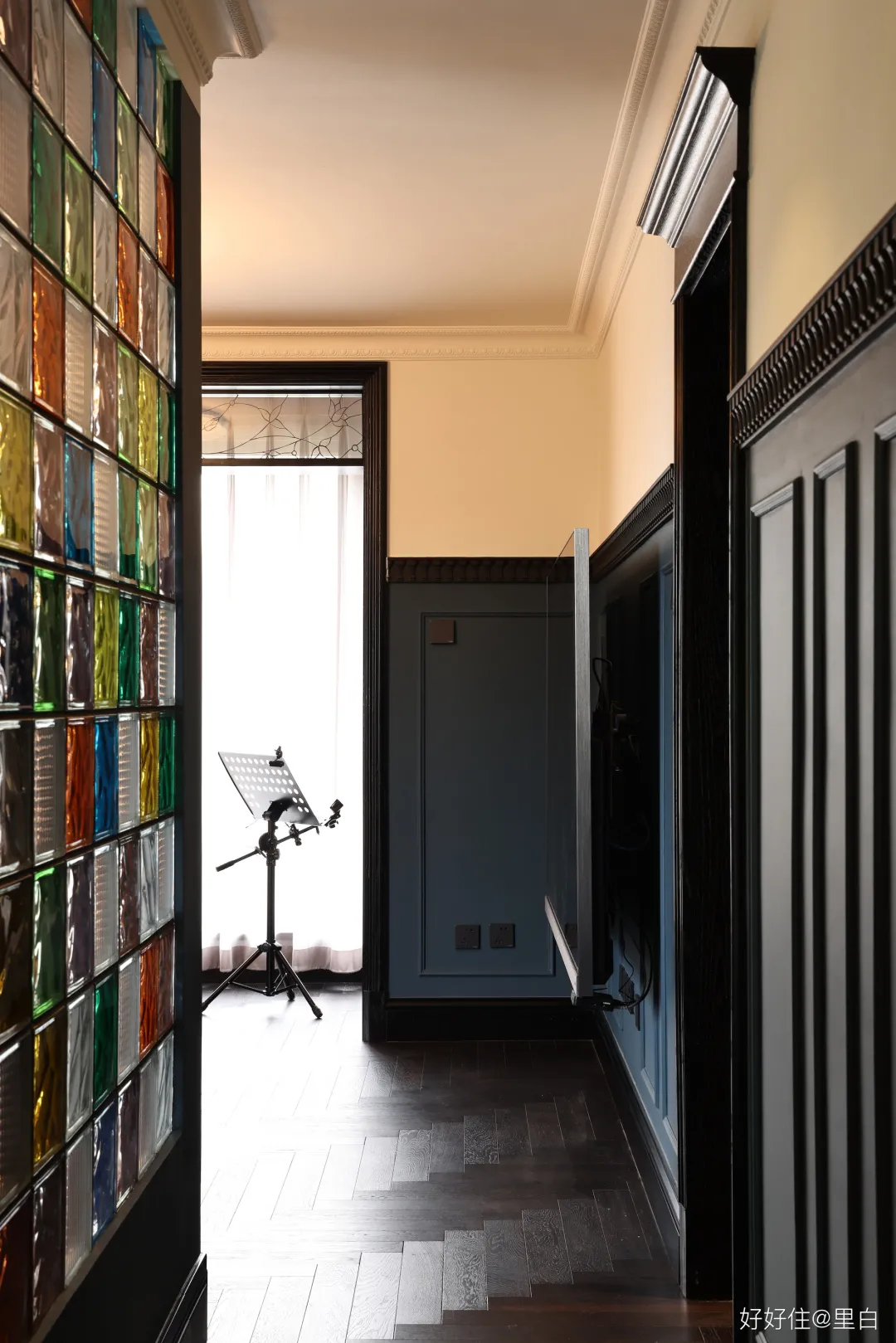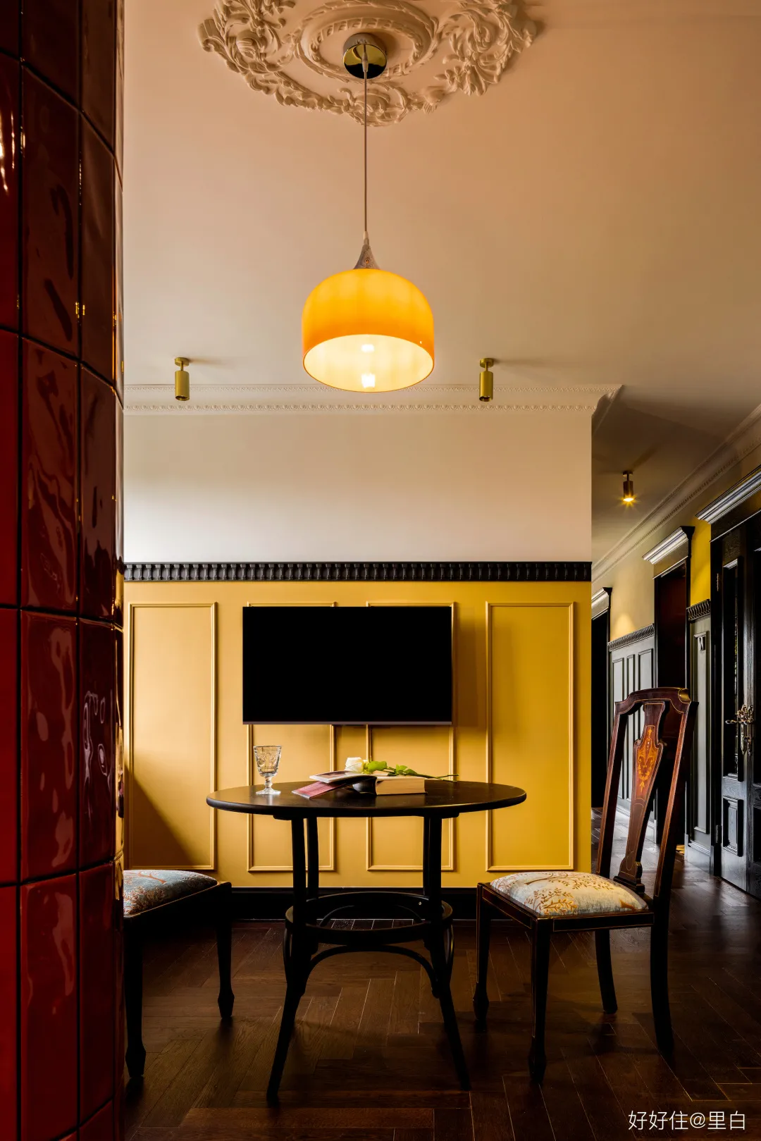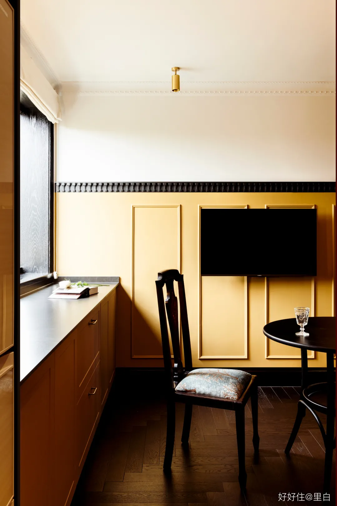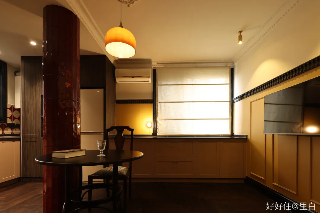好在設計師用他的方式,替他們圓了這個夢:2.5m 的層高沒什麼優勢,為了實現英式建築那種大氣恢宏的古典感,就補充了一些裝飾元素。