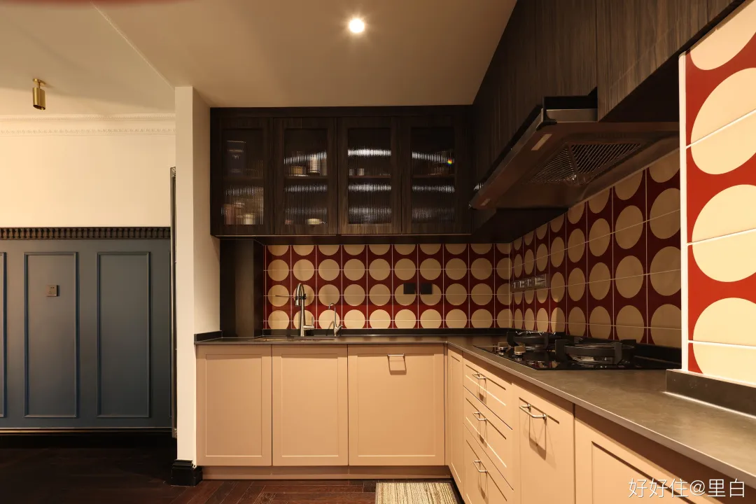 餐廚在走廊左側,整體色調圍繞著紅黃藍三原色,紅色藍色偏深,用黃色提亮,整個空間不至於昏暗。
