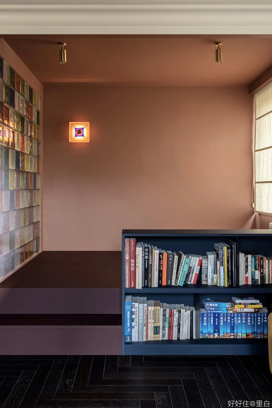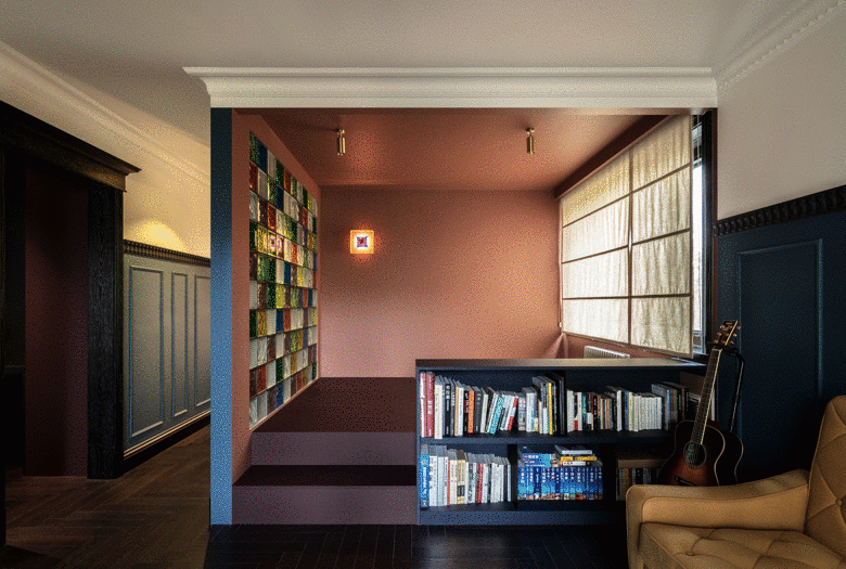 睡眠艙整體色調深沉,與彩繪玻璃磚相呼應。牆面偏磚紅,地臺偏紫紅色,搭配鈷藍色書架,營造靜謐的氛圍。