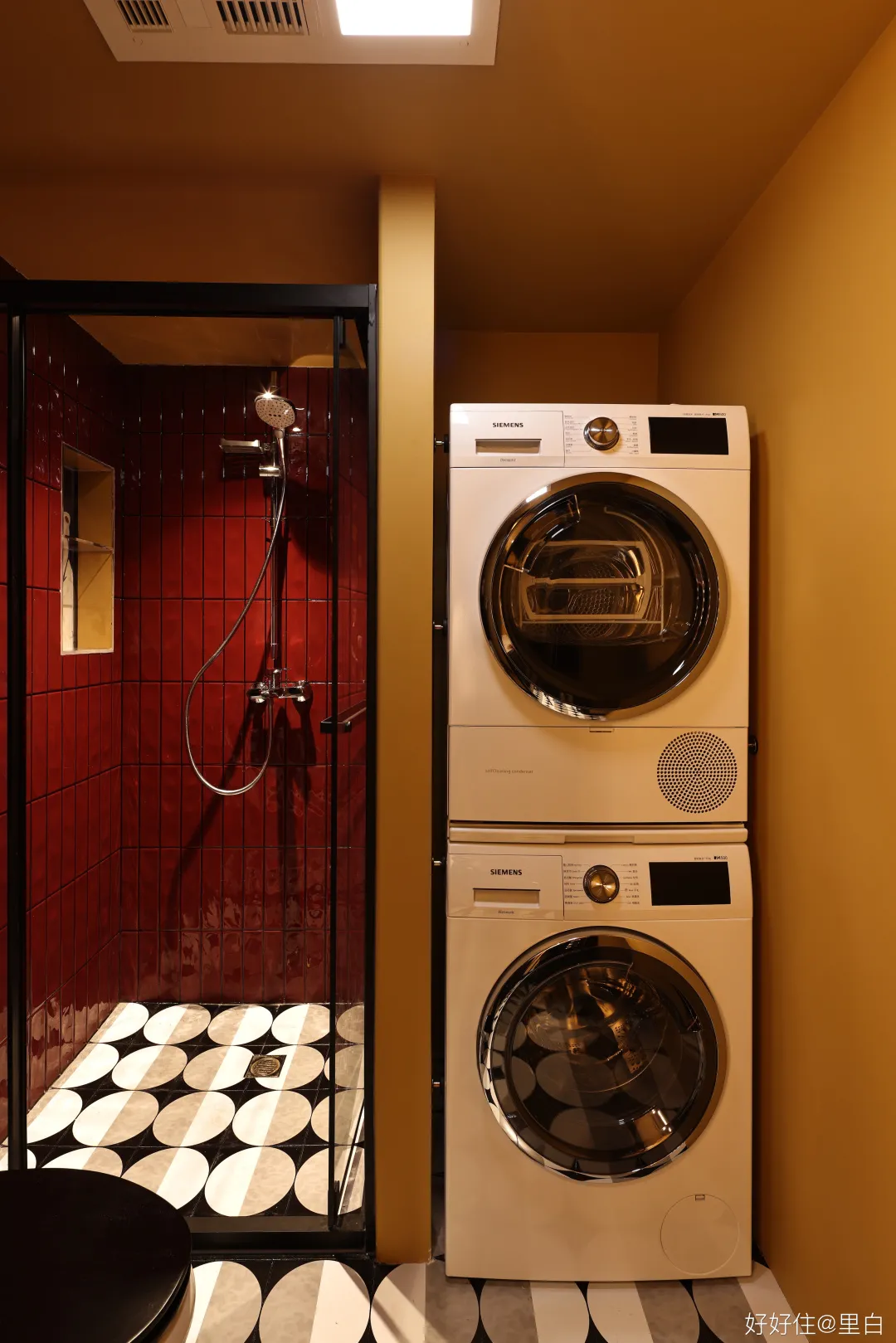 溼區空間很緊湊,洗衣區與淋浴區並排而立,淋浴房門採用了內開的軌道摺疊門,避免開門影響馬桶使用。