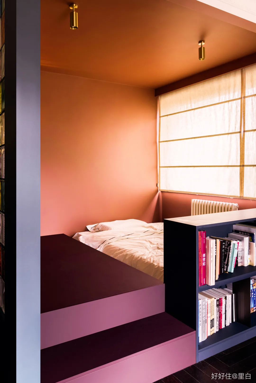 側面有矮書櫃,方便隨手閱讀。男主人擅長吉他,女主人則是專業的大提琴手,床邊的地臺,就是他們的家庭音樂廳。