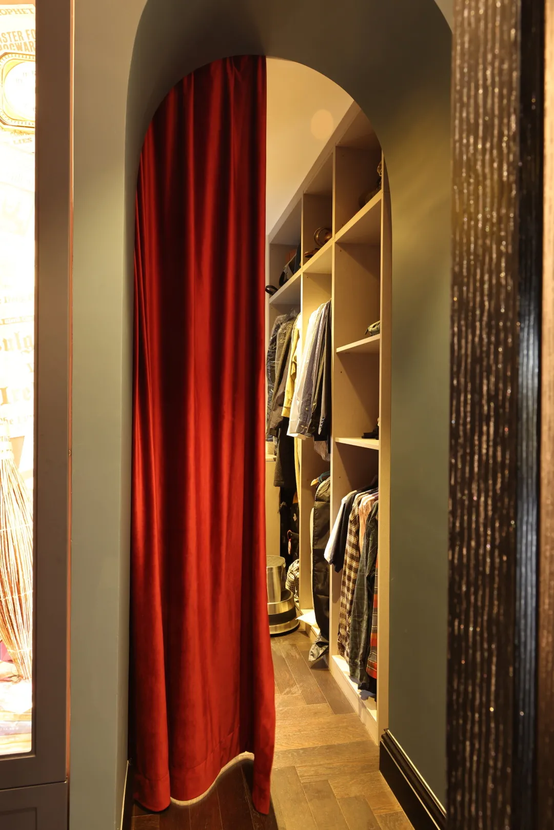 衣帽間的拱形門,紅色天鵝絨簾有很強的戲劇感。