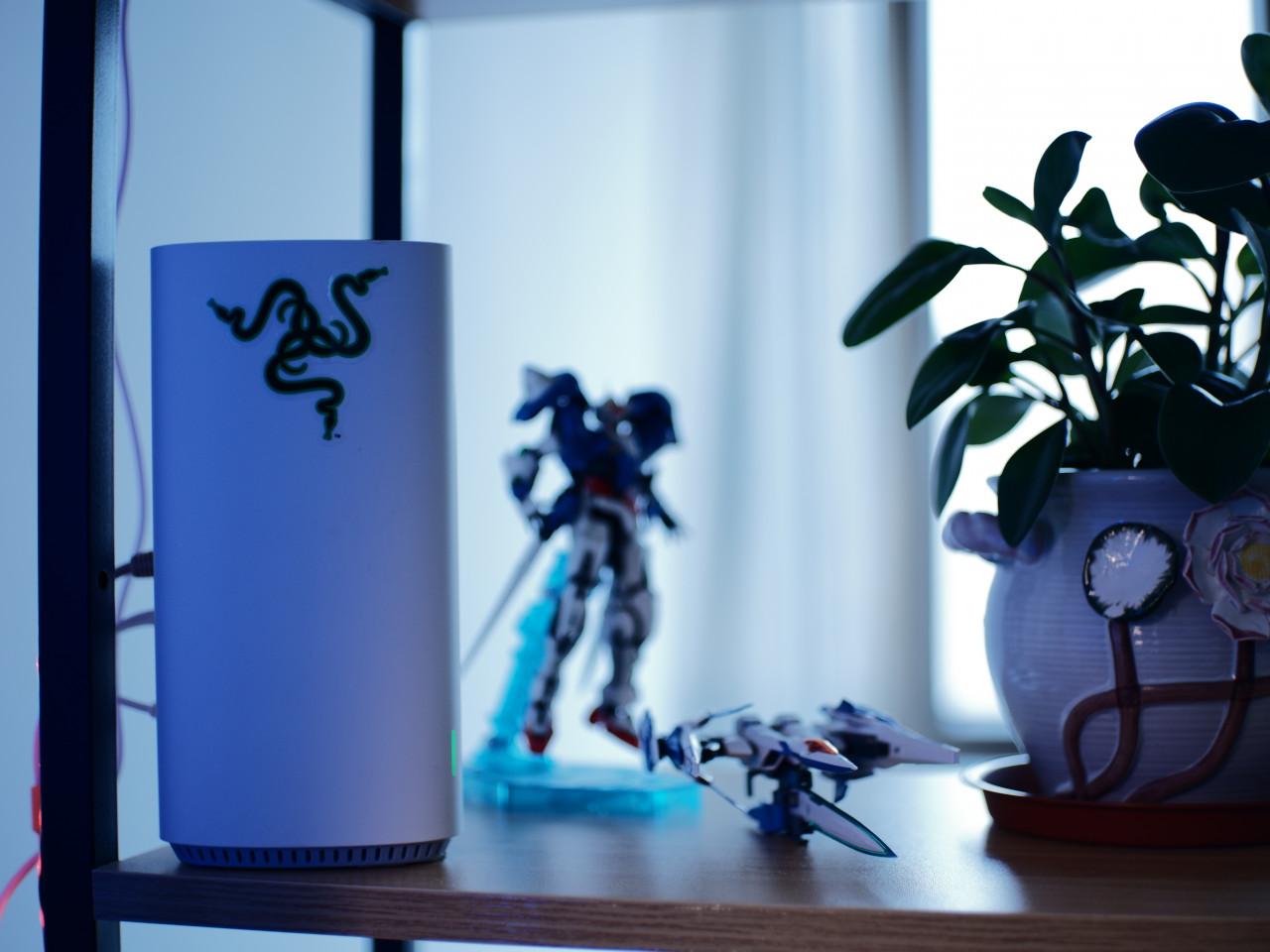 架子二層本來想放印表機的,後來覺得還是放水壺杯子更順手,三層則是路由器、模型手辦跟一盆綠植。