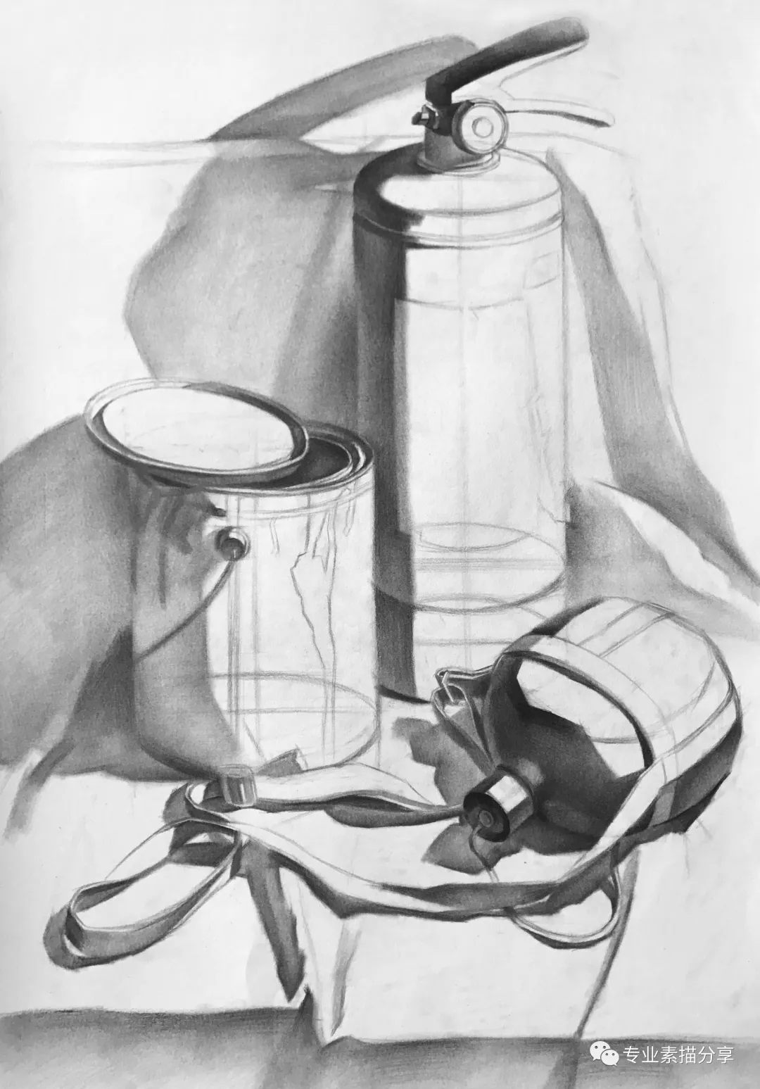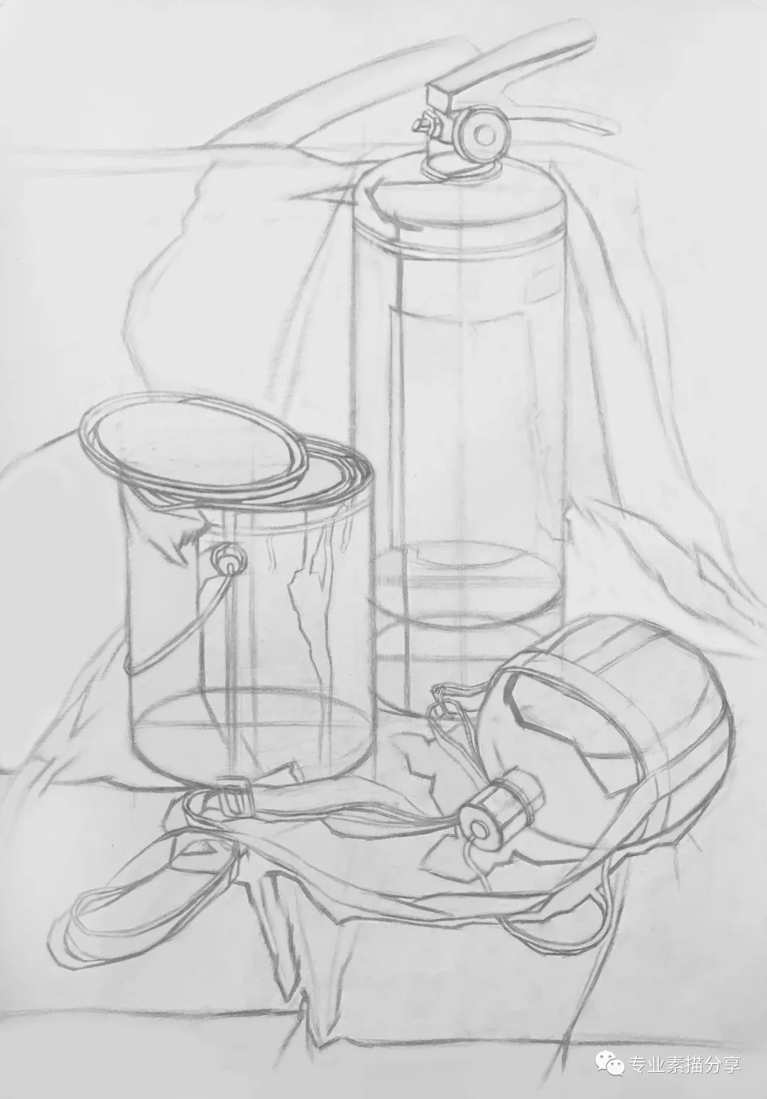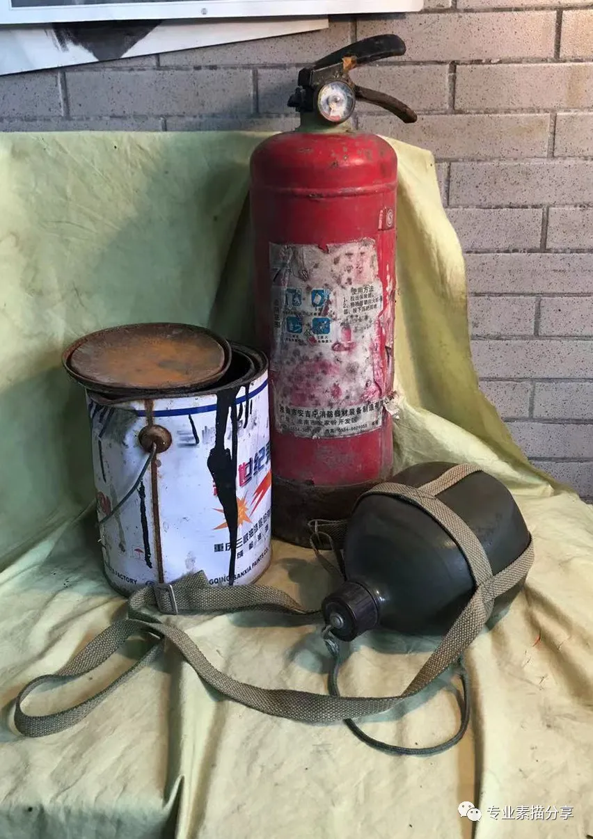 這組靜物有三個物體,滅火器、油漆桶、軍用水壺。觀察這組靜物,能夠發現滅火器細節最豐富,其次是油漆桶,軍用水壺細節最少。所以整幅畫的視角中心為滅火器,需要刻畫出廢舊破損的質感,油漆桶上面的文字和花紋是次要表現的地方。