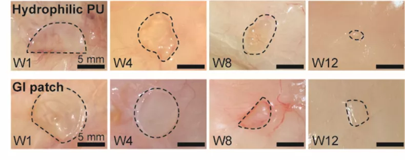 圖 | 分別植入大鼠皮下模型1、4、8、12周聚氨酯和手術貼片圖(來源:Science Translational Medicine)