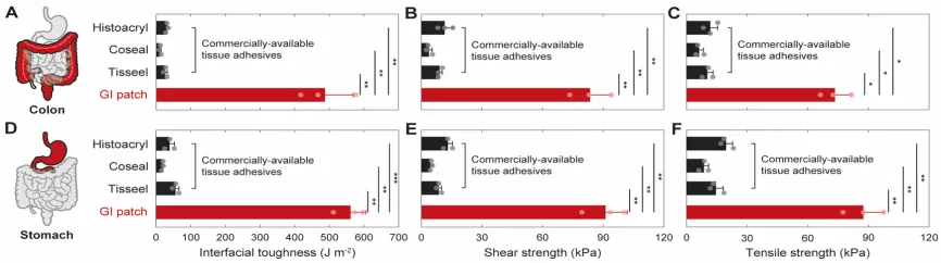 吳晶晶表示,手術貼片具有與胃腸道組織相匹配的力學效能,具有柔軟,可拉伸,高強度等特點。硬度過高的材料會導致腸道扭曲變形,而力學效能過低的材料使得其與腸道作用過程中容易脫落。同時與市售的組織粘合劑和密封劑相比, 胃腸貼片表現出優異的粘附效能,具有高的介面韌性、剪下強度和拉伸強度。